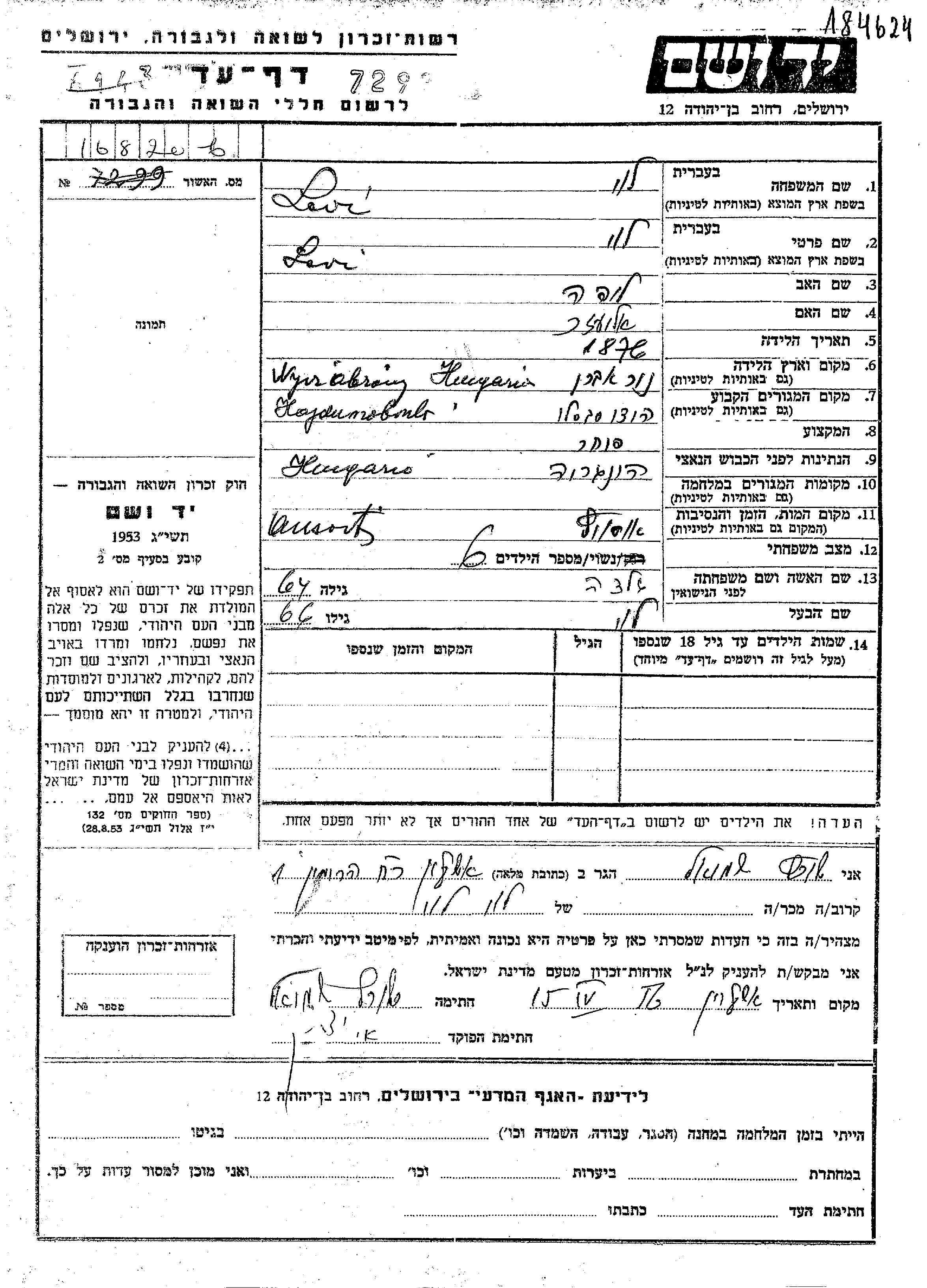 Levi Levi est né à Nyirabrany, Hongrie en 1876, fils de Eliezer et de Lipa. Il était Commerçant/e et Mariée à Golda. Avant la seconde guerre mondiale il vivait à Hojdubesermen, Hongrie.