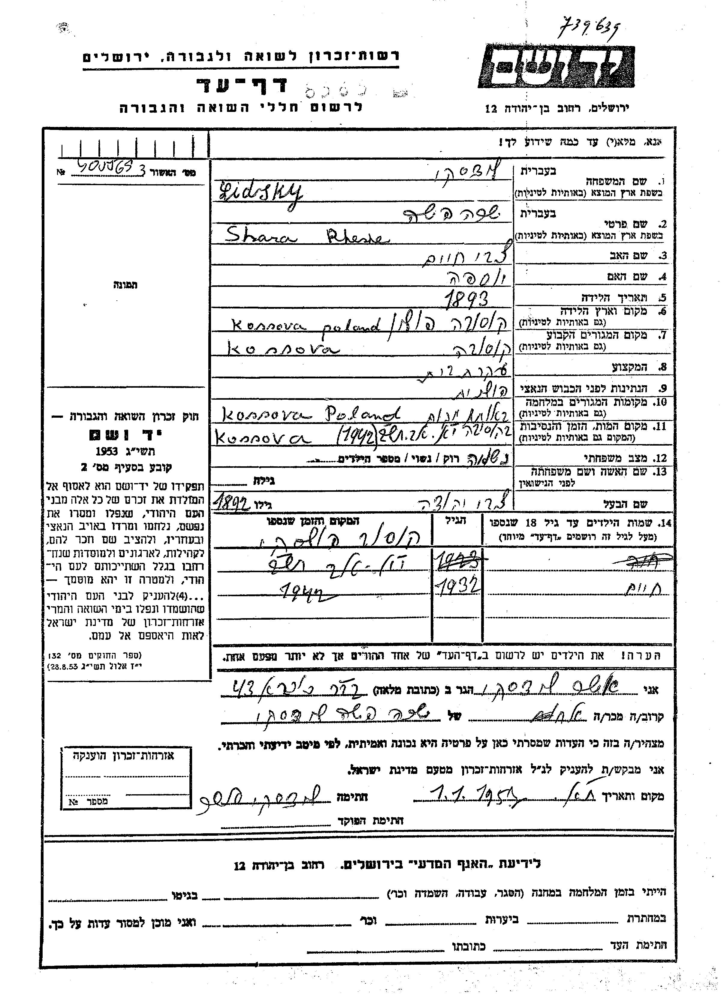 Shara Rhezhe Lidsky est née à Kosowo, Pologne en 1893, fille de Tzvi Khaim et de Yosefa. Elle était Femme au foyer et Mariée à Tzvi Yehuda. Avant la seconde guerre mondiale elle vivait à Kosowo, Pologne. Pendant la guerre, elle était à Kosowo, Pologne.