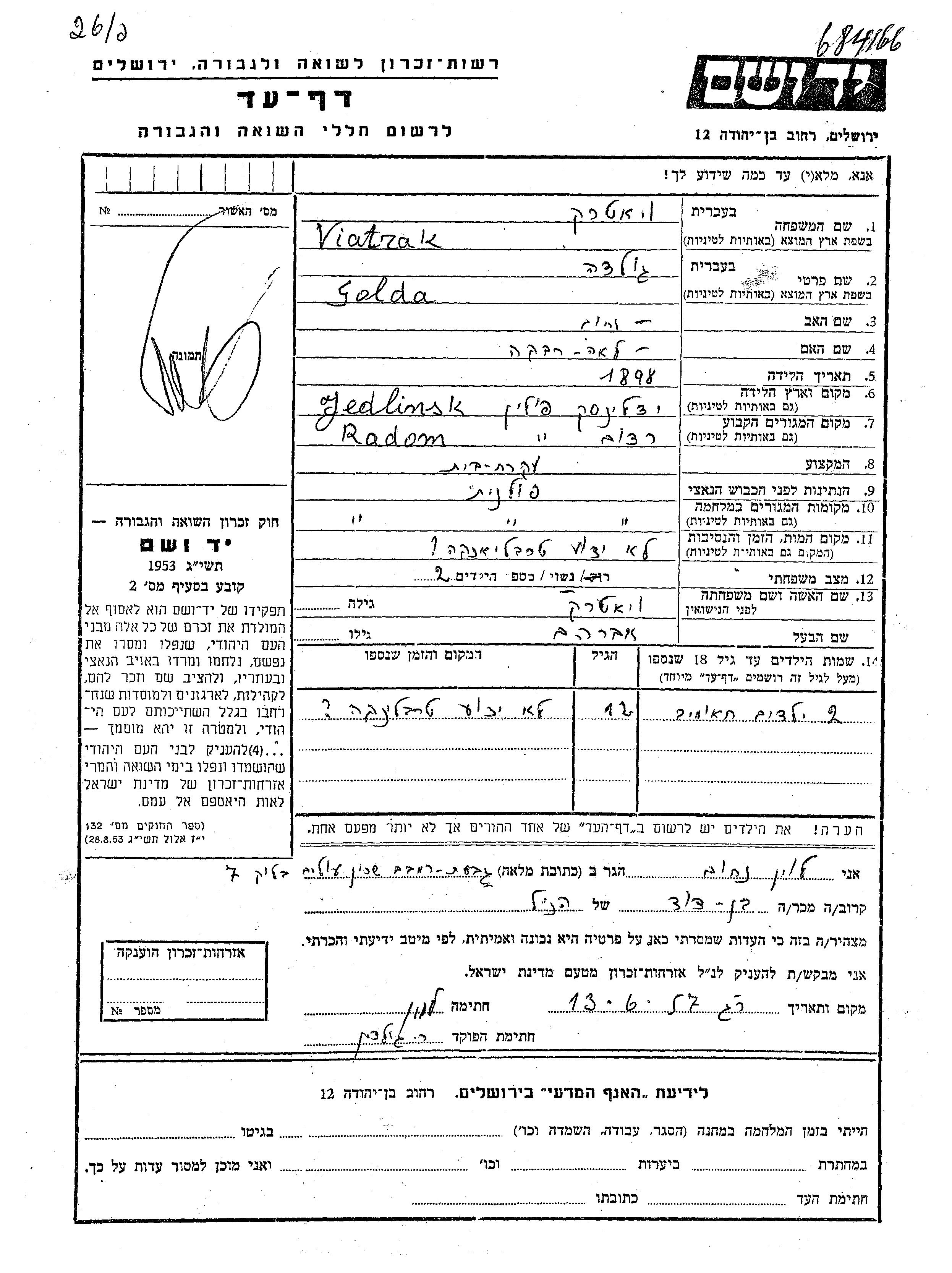 Golda Viatrak née Viatrak est née à Yedlinsk, Pologne en 1898, fille de Nakhum et de Lea Rivka. Elle était Femme au foyer et Mariée à Avraham. Avant la seconde guerre mondiale elle vivait à Radom, Pologne. Pendant la guerre, elle était à Radom, Pologne.
