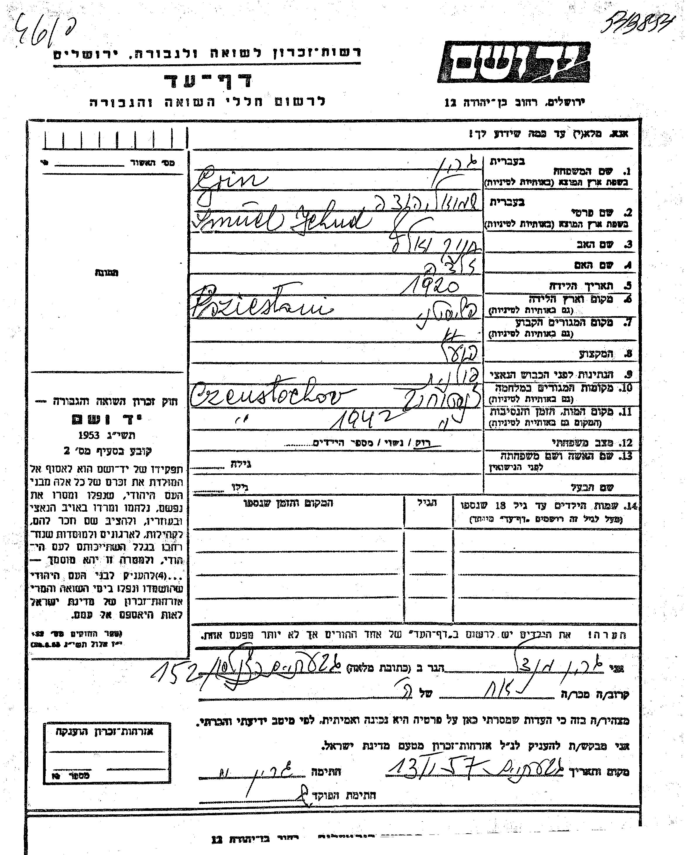 Szmuel Yehud a été assassiné pendant la Shoah. Lieu de la mort: Czestochow, Pologne en 1942.