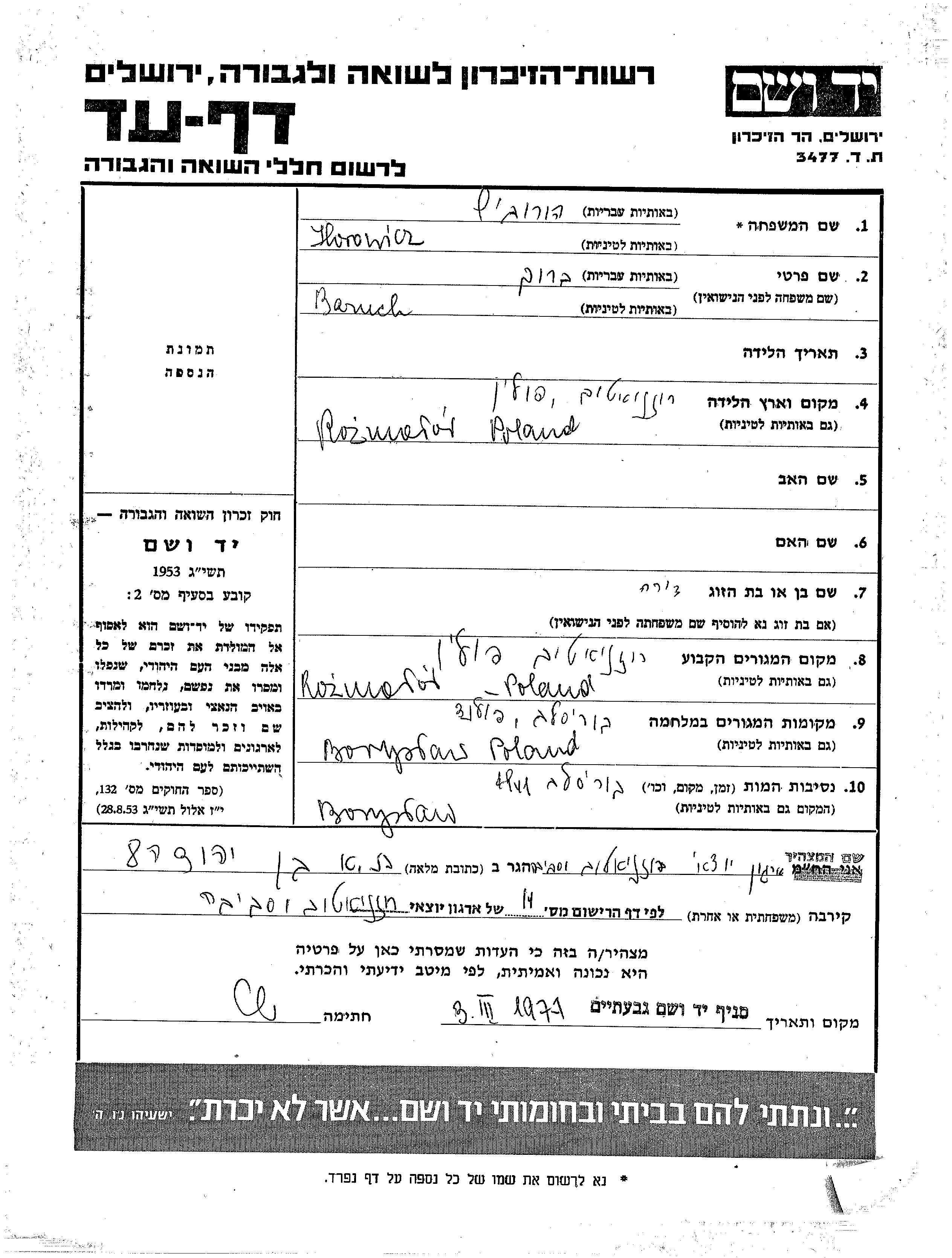 Horowicz Baruch Rożniatów, Pologne Feuille de témoignage
