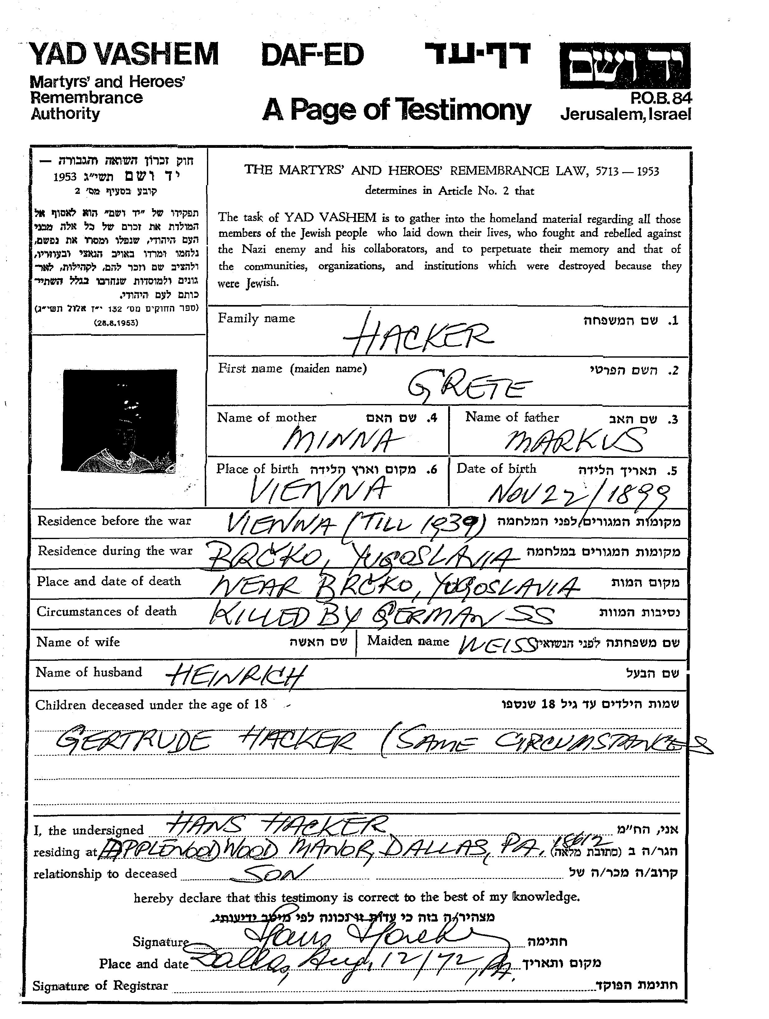 Grete Hacker née Weiss est née à Vienna, Autriche en 1899, fille de Markus et de Minna. Elle était Mariée à Heinrich. Avant la seconde guerre mondiale elle vivait à Vienna, Autriche. Pendant la guerre, elle était à Brcko, Yugoslavie.