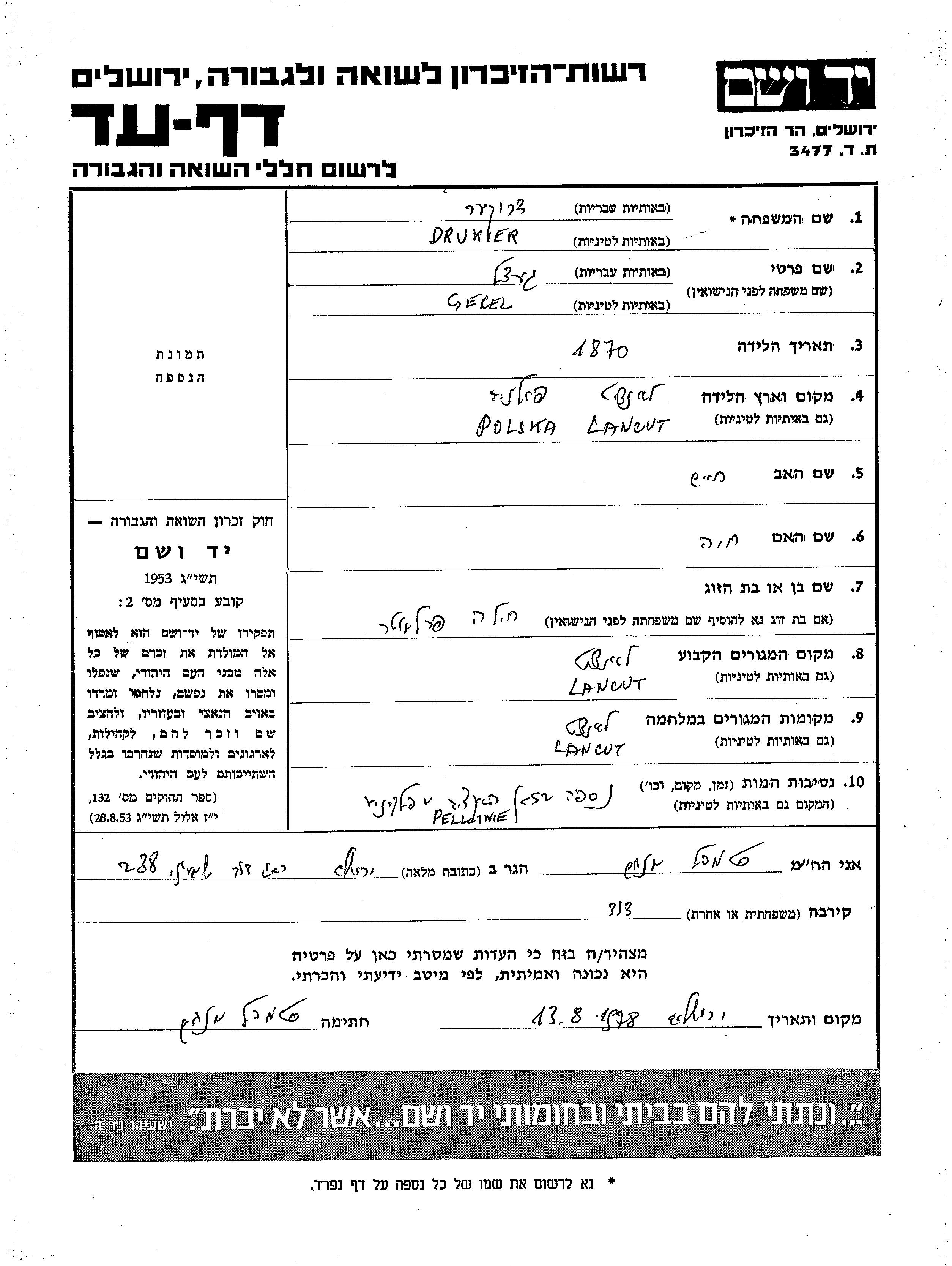 Gecel Druker est né à Lancut, Pologne en 1870, fils de Khaim et de Khaia. Il était Mariée à Khila née Perlmuter. Avant la seconde guerre mondiale il vivait à Lancut, Pologne. Au cours de la guerre, il était à Lancut, Pologne.