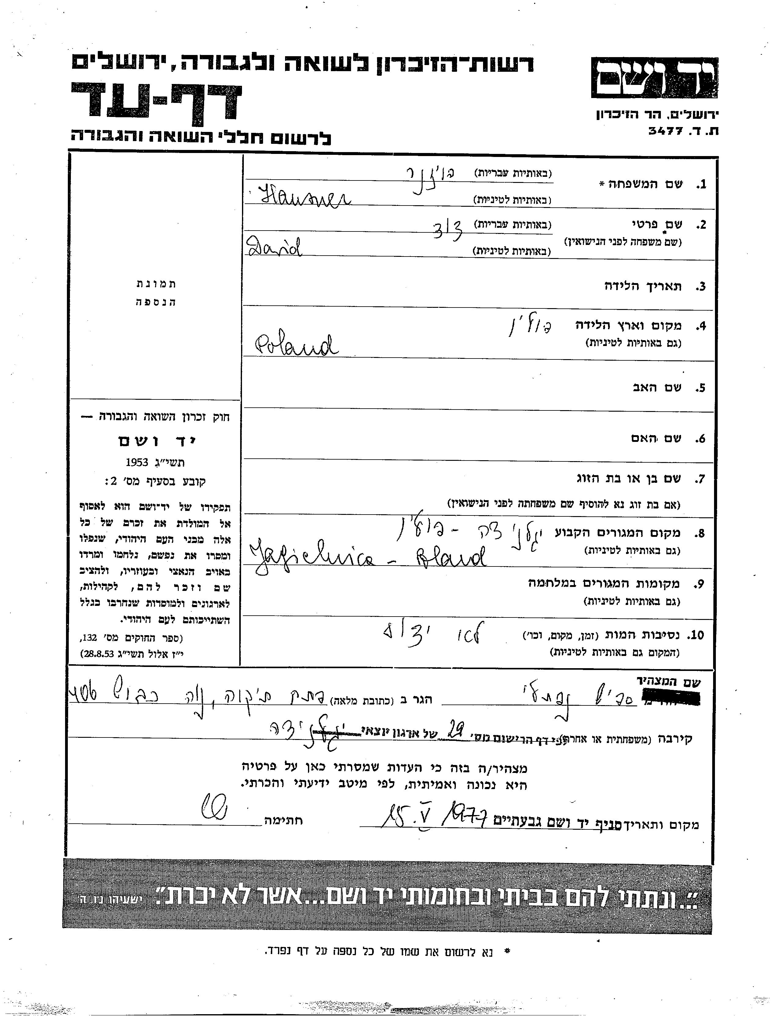 Hauzner David Jagielnica, Pologne Feuille de témoignage