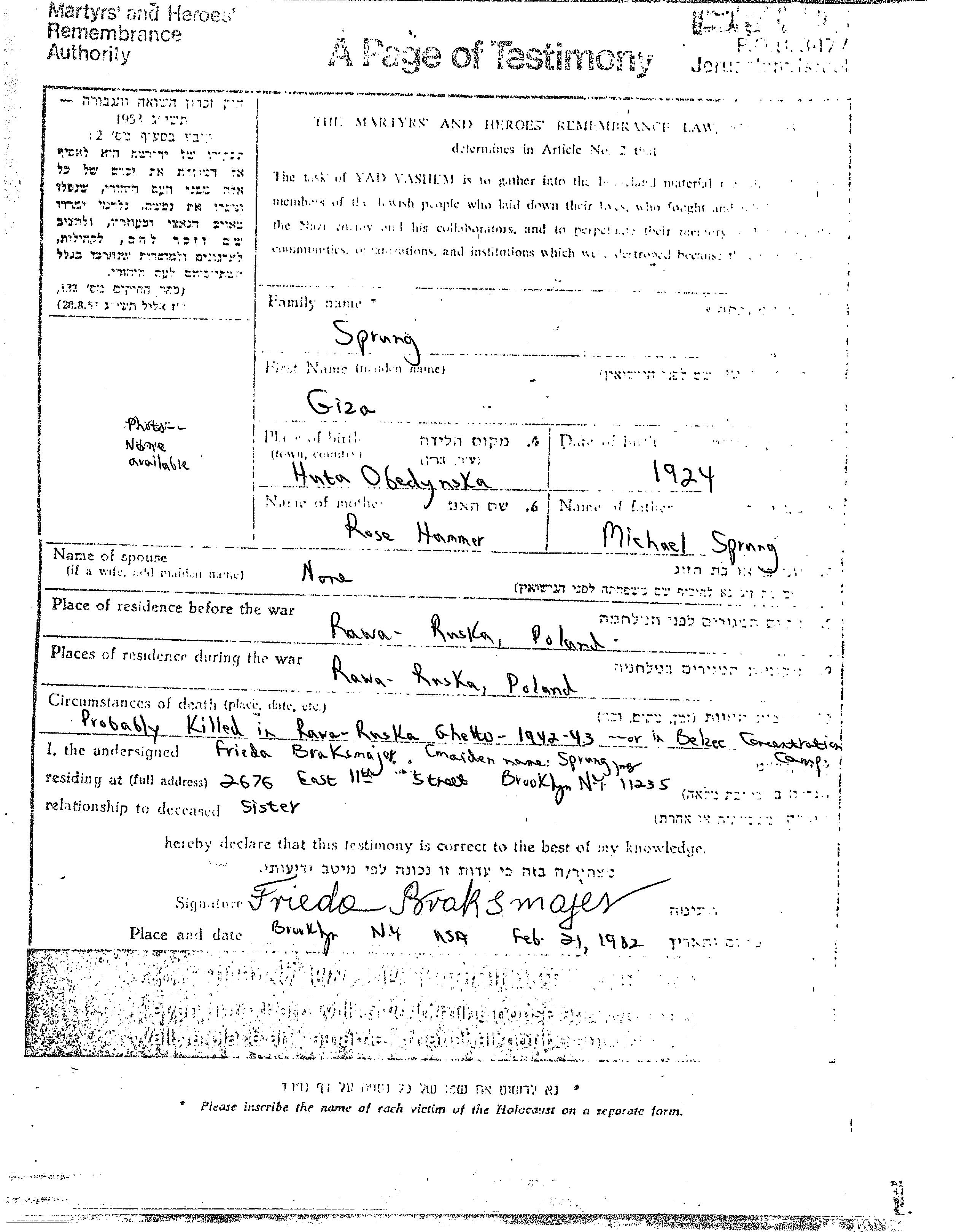 Giza Sprung est née à Huta Obedynska, Pologne en 1924, fille de Michael et de Rose. Elle était Célibataire. Avant la seconde guerre mondiale elle vivait à Rawa Ruska, Pologne. Pendant la guerre, elle était à Rawa Ruska, Pologne.