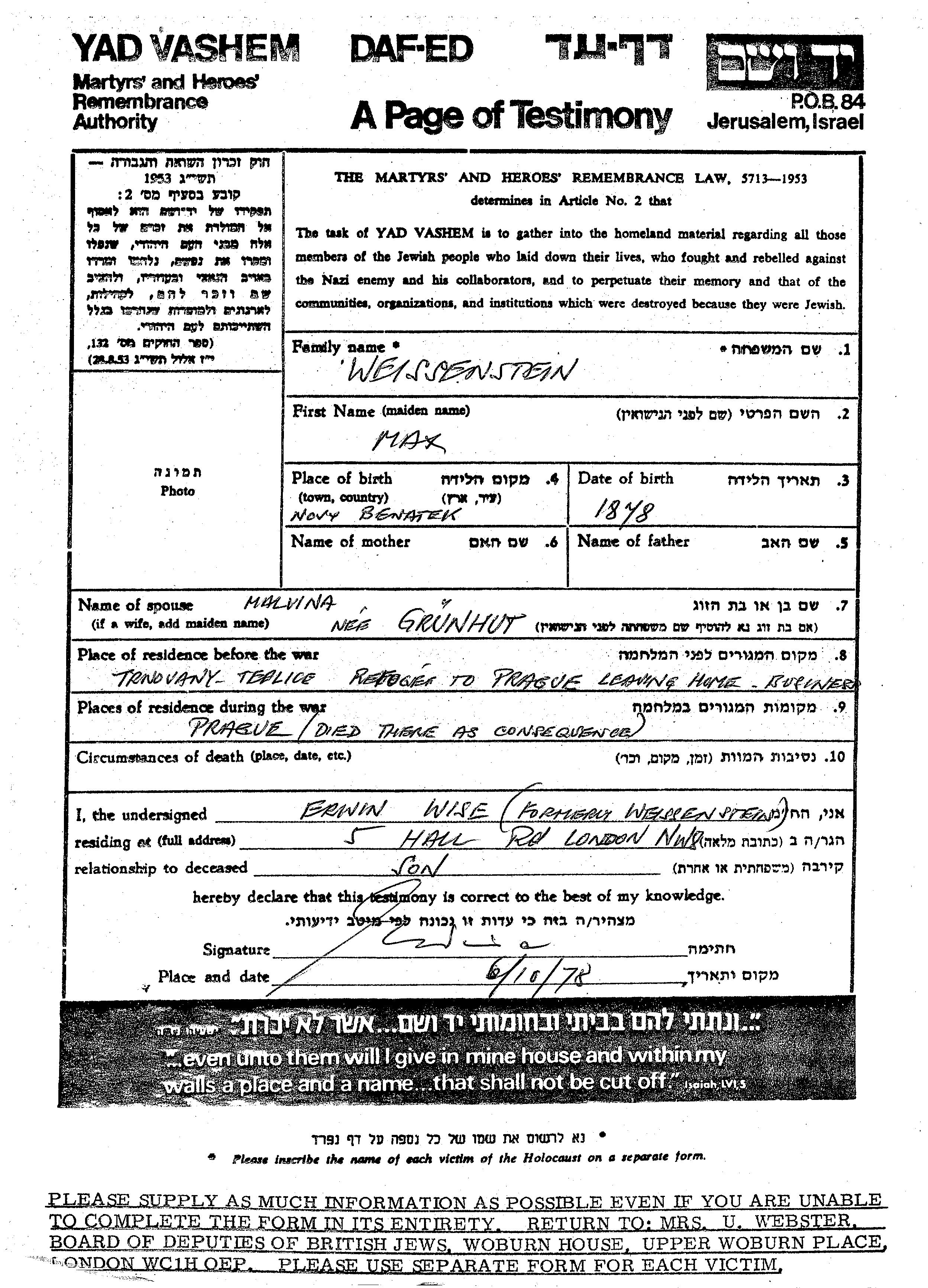 Max Weissenstein est né à Nove Benatky, Tchécoslovaquie en 1878. Avant la seconde guerre mondiale il vivait à Prague, Tchécoslovaquie. Au cours de la guerre, il était à Prague, Tchécoslovaquie.