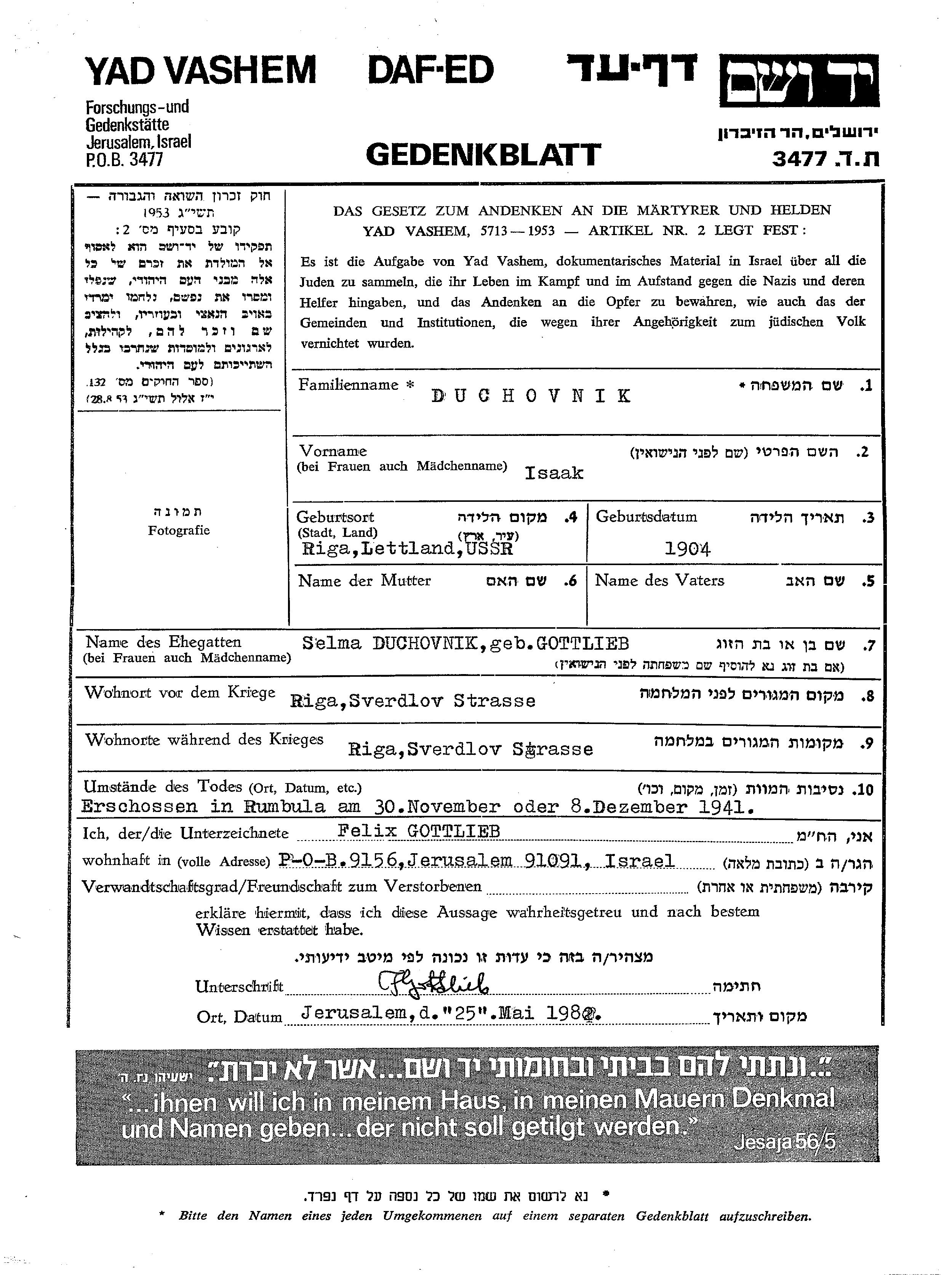 Isaak Duchovnik est né à Riga, Lettonie en 1904. Il était Mariée à Selma née Gottlieb. Avant la seconde guerre mondiale il vivait à Riga, Lettonie. Au cours de la guerre, il était à Riga, Lettonie.