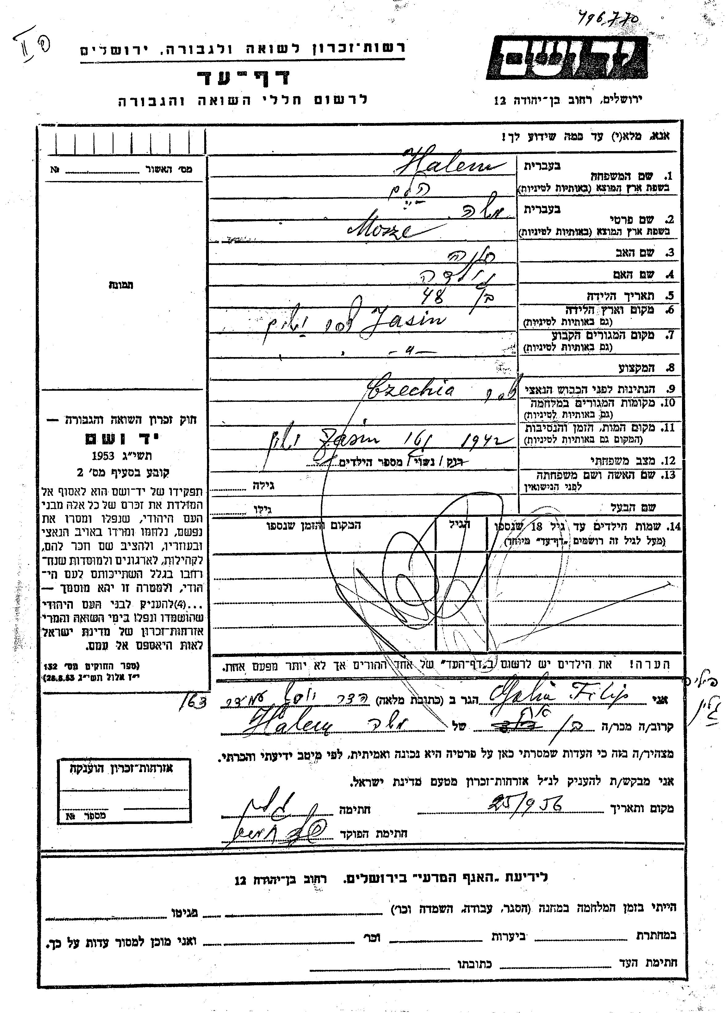 Halem Mosze Jasin, Tchécoslovaquie Feuille de témoignage