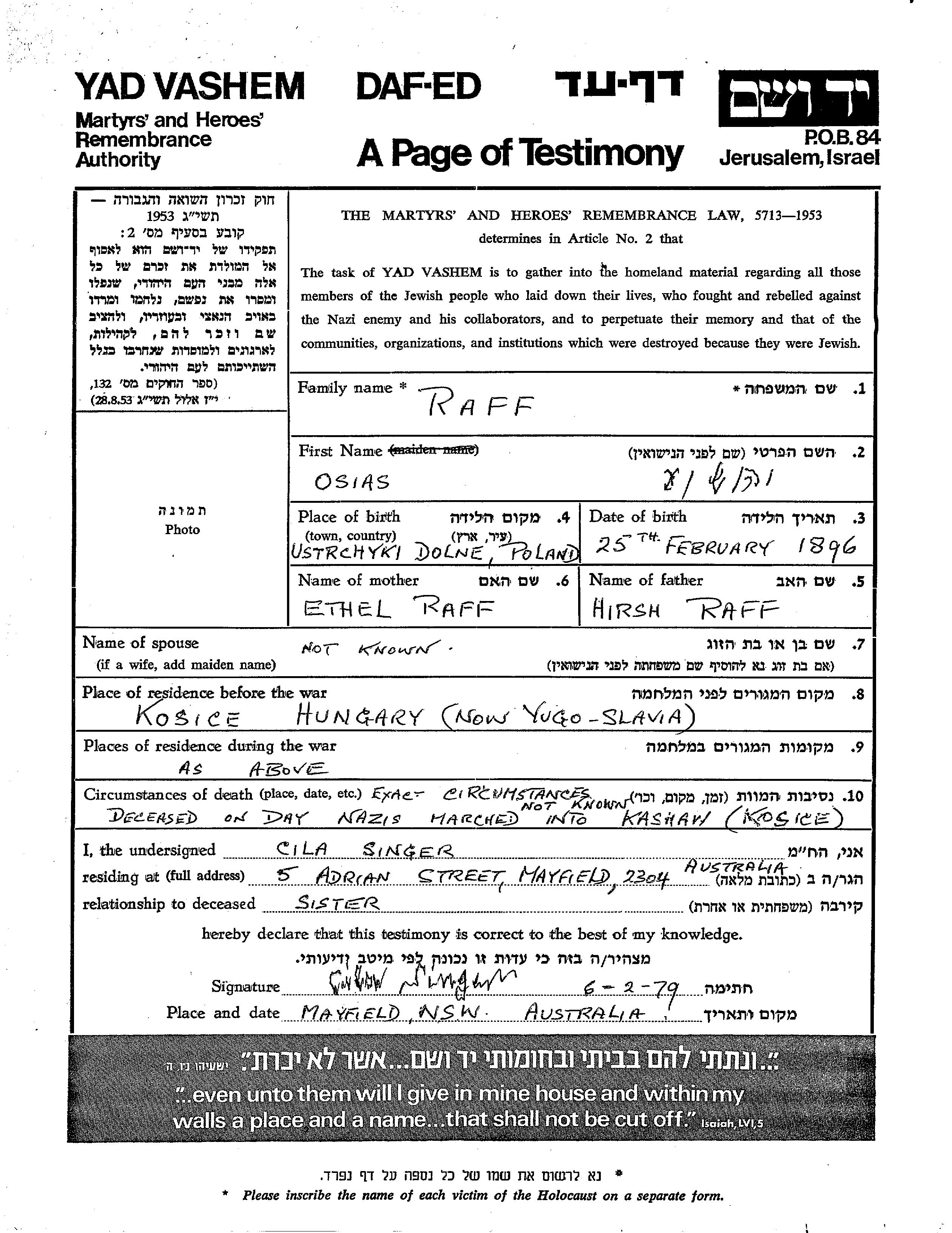 Raff Osias Yehoshua 1896 Kosice, Tchécoslovaquie Feuille de témoignage