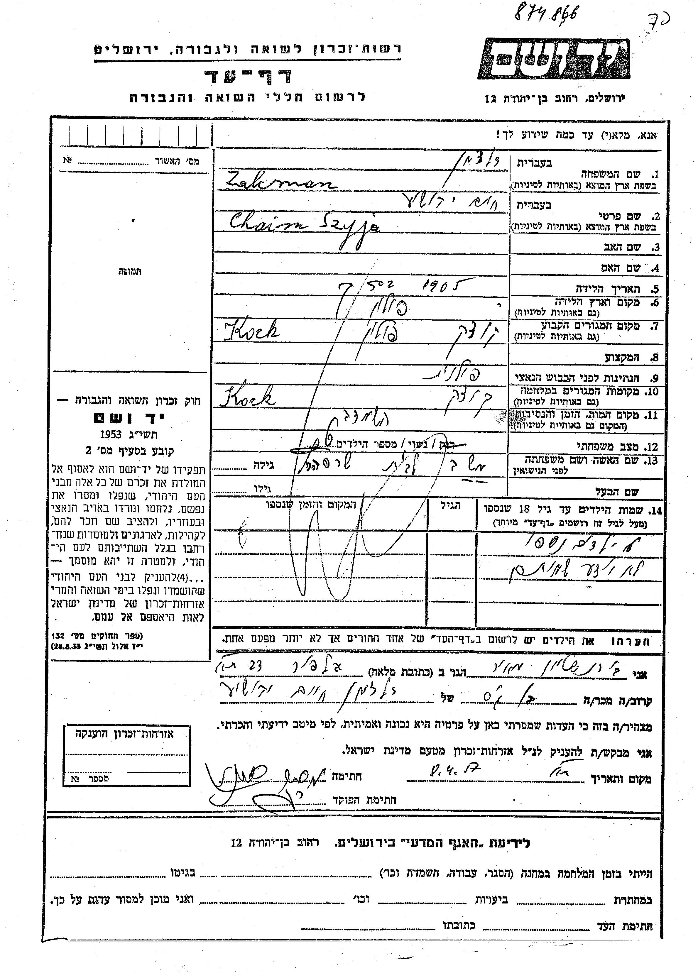Zalcman Chaim Szyja 1905 Kock, Pologne Feuille de témoignage