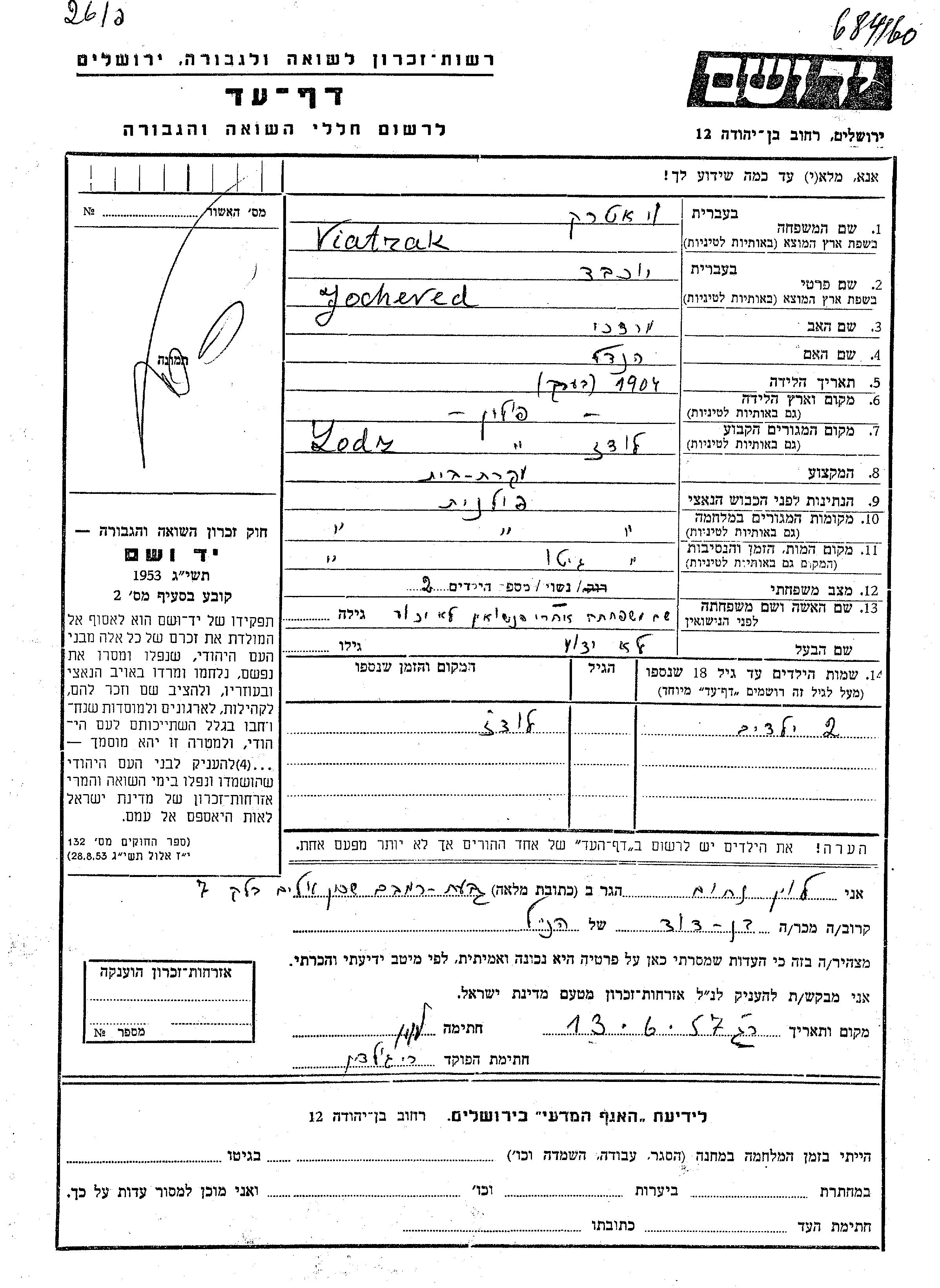 Yocheved Viatrak née Viatrak est née à Pologne en 1904, fille de Mordekhai et de Hendel. Elle était Femme au foyer et Mariée. Avant la seconde guerre mondiale elle vivait à Lodz, Pologne. Pendant la guerre, elle était à Lodz, Pologne.