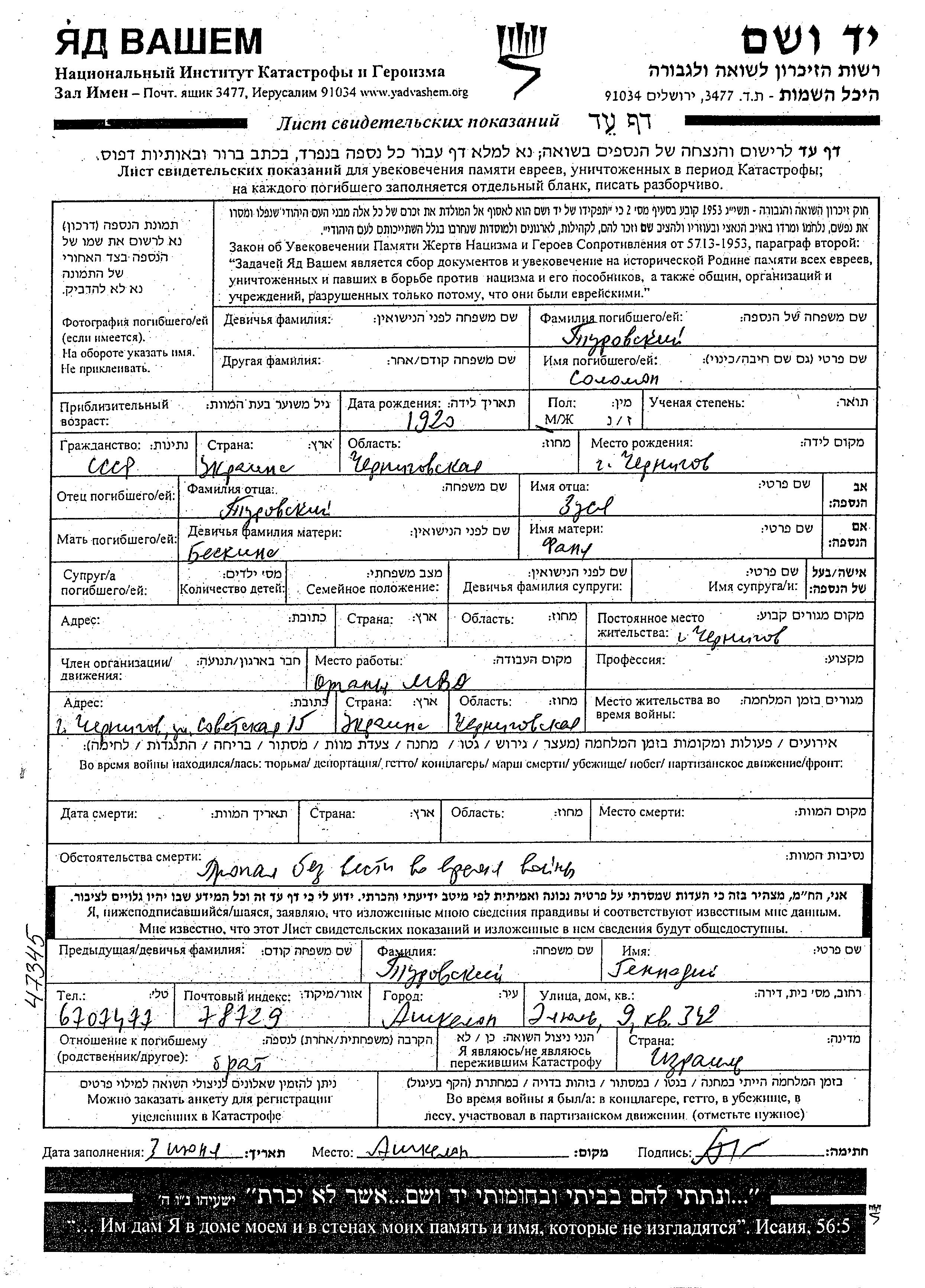 Turovski Solomon 1920 Chernigov, Ukraine (URSS) Feuille de témoignage