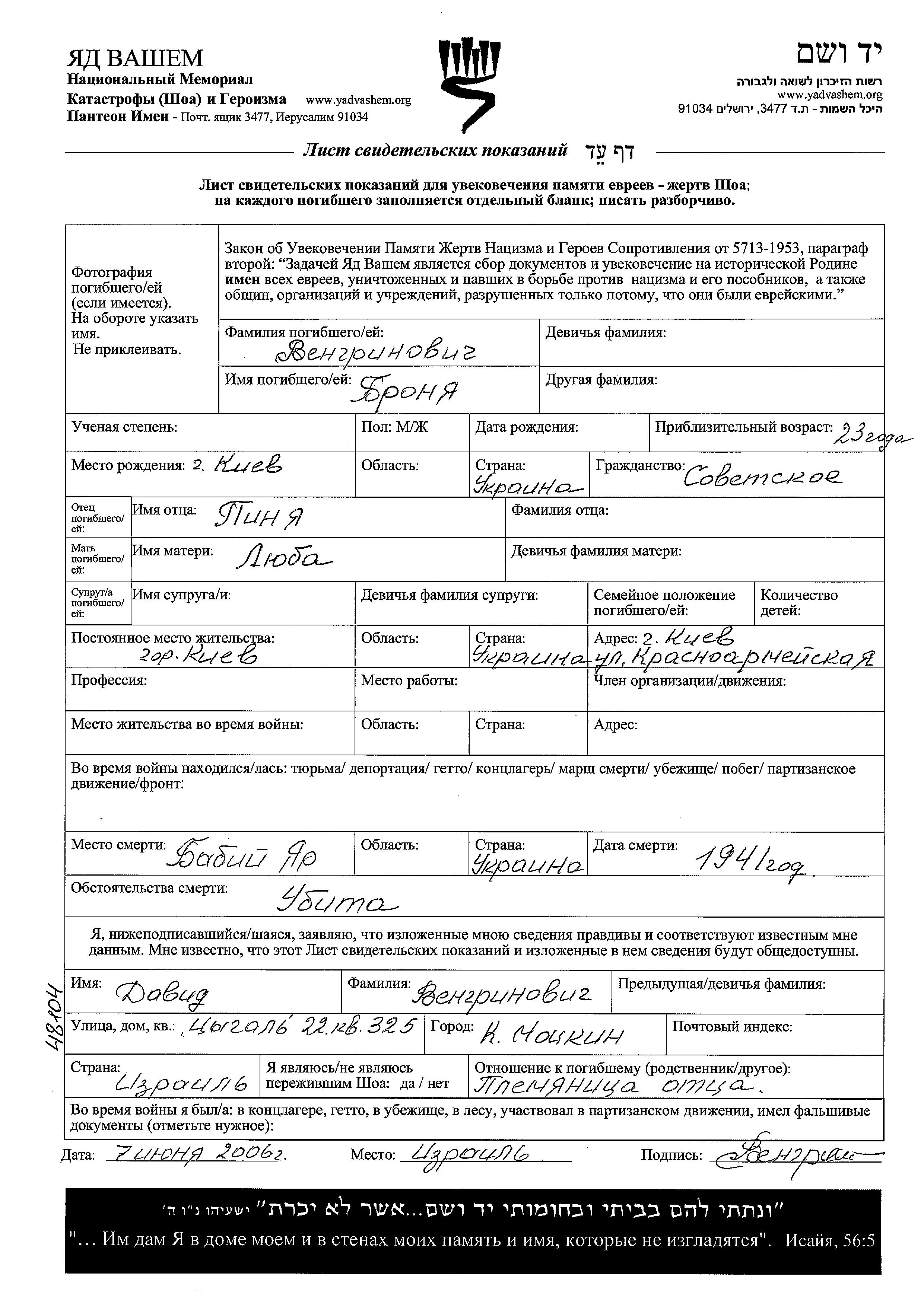 Vengrinovich Bronya Kiev, Ukraine (URSS) Feuille de témoignage