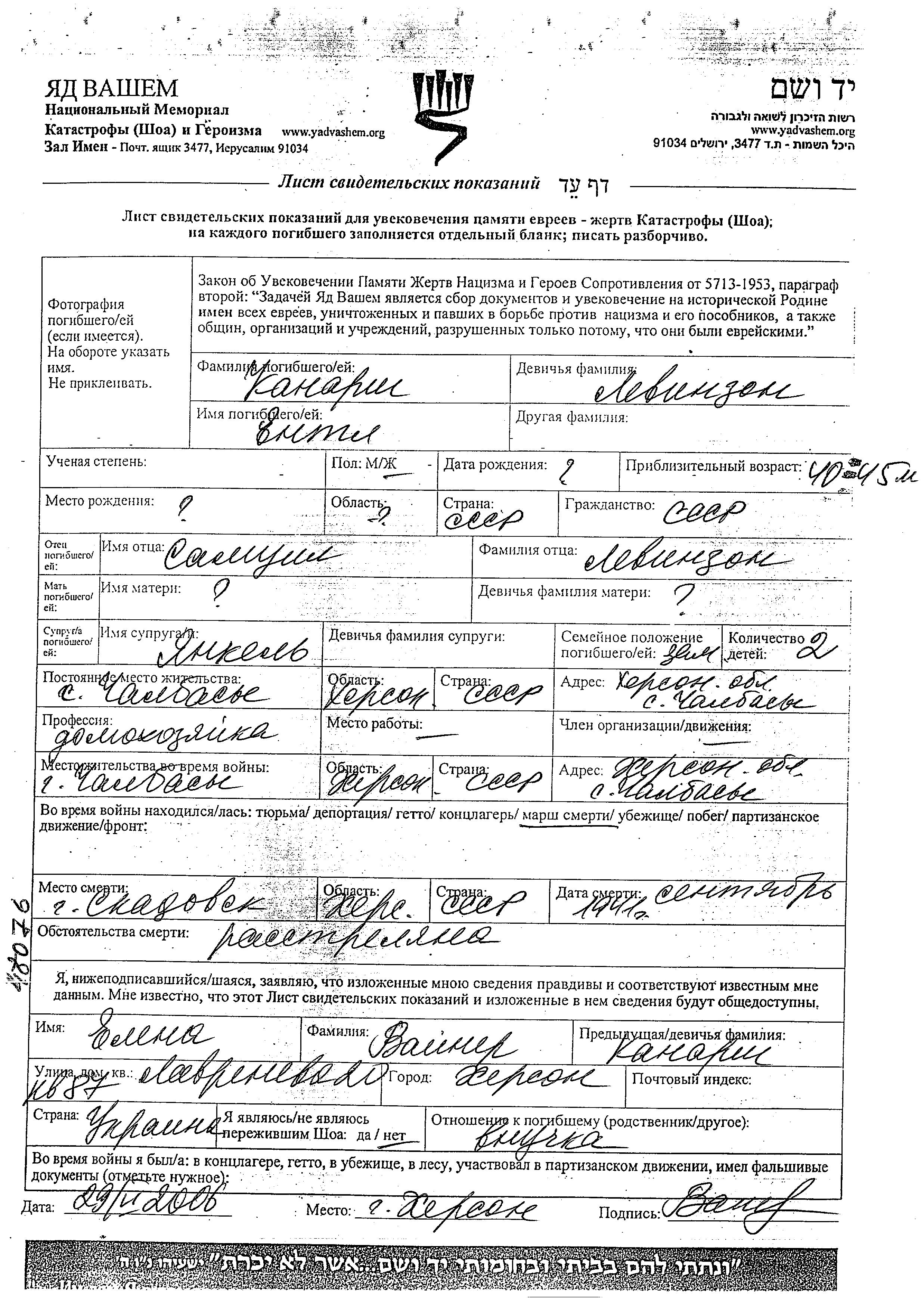 Kanarsh Yentl Chalbasy, Ukraine (URSS) Feuille de témoignage