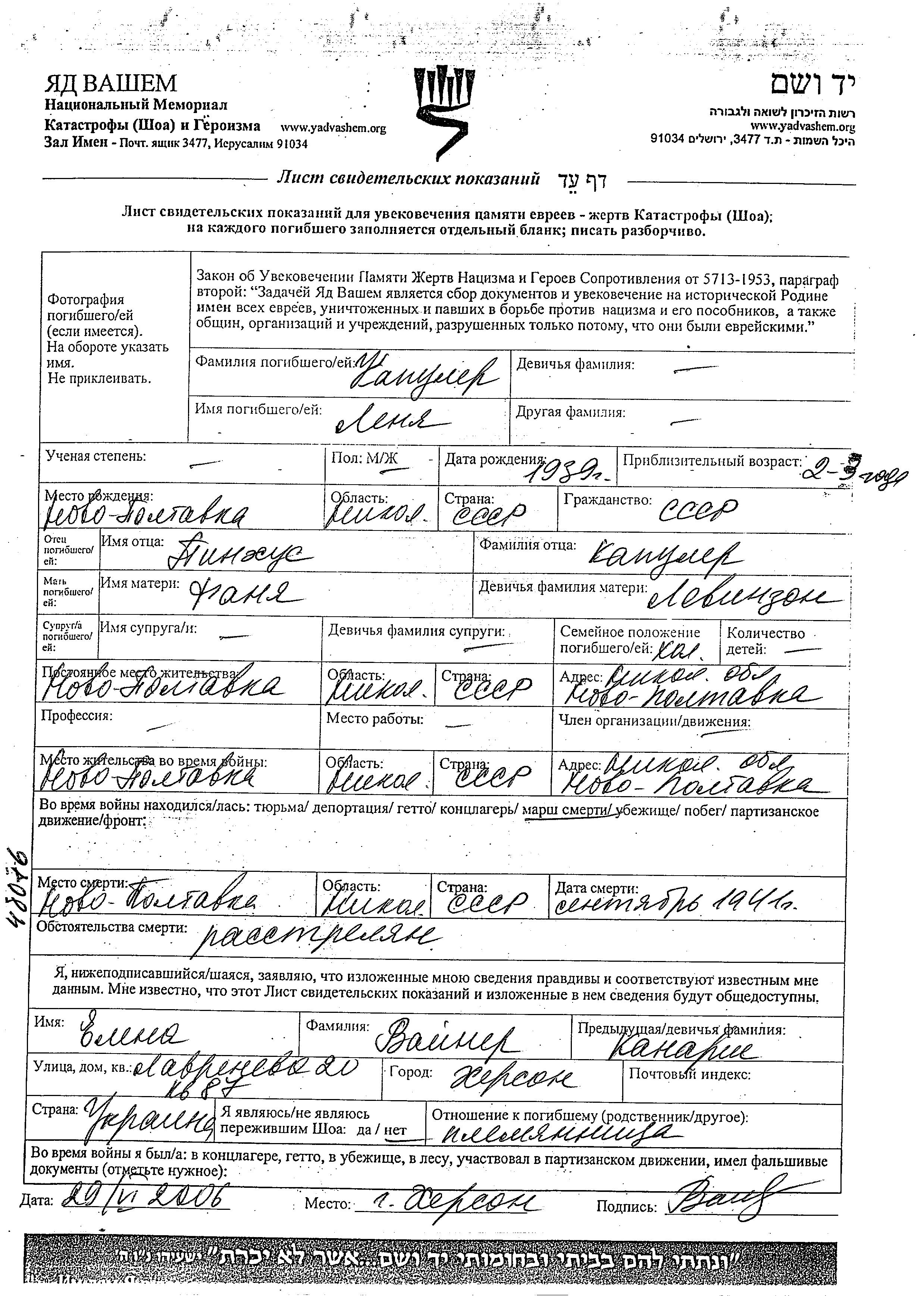 Yad Vashem - Pages of Testimony Names Memorial Collection
