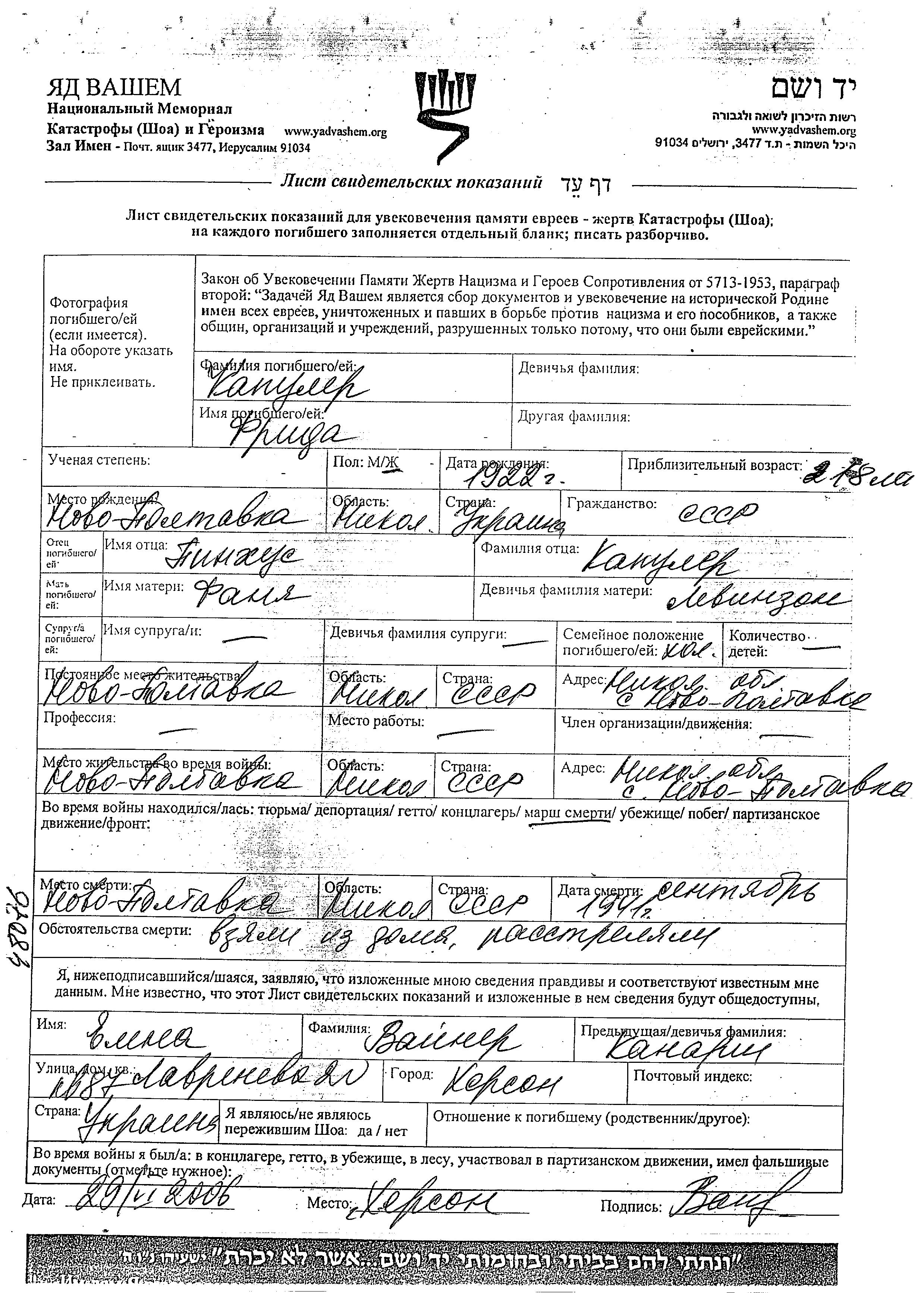 Yad Vashem - Pages of Testimony Names Memorial Collection