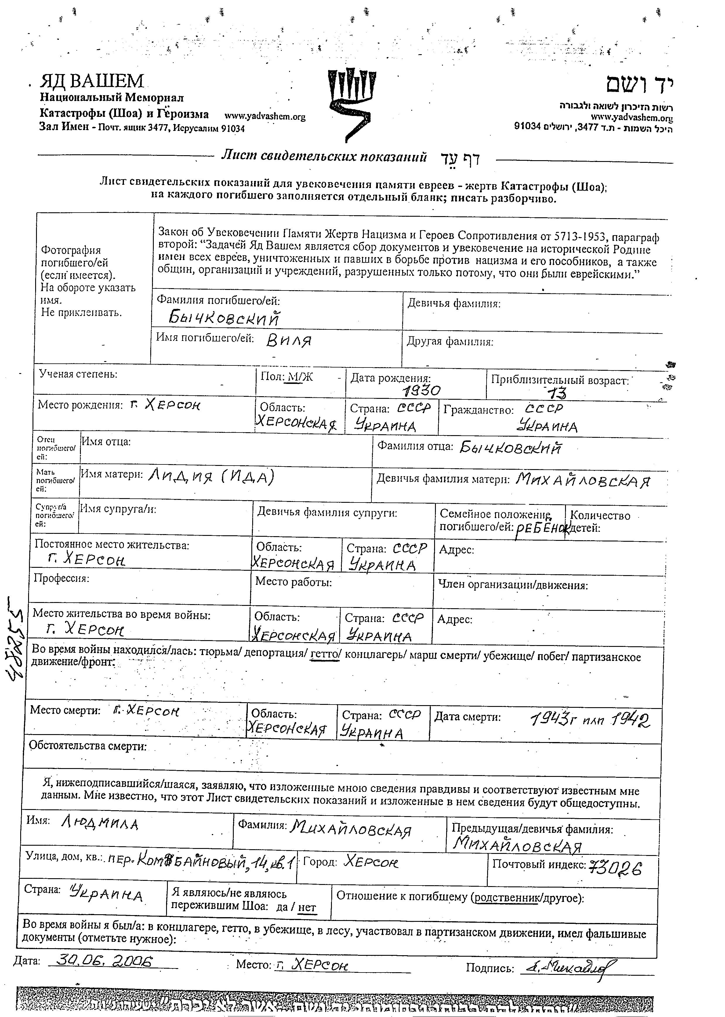 Bychkovski Vilya 1930 Kherson, Ukraine (URSS) Feuille de témoignage