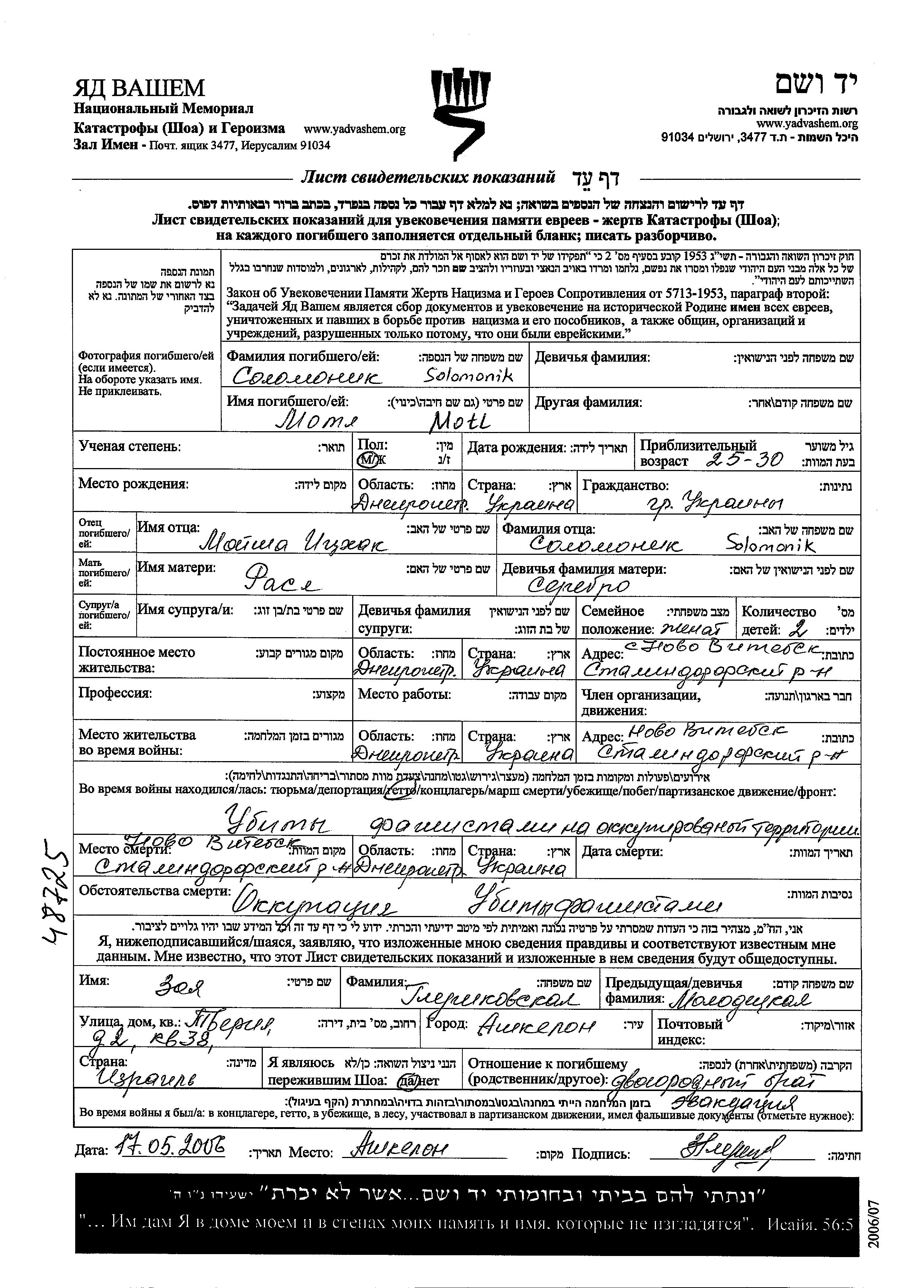 Motl Solomonik est né à Dnepropetrovsk, Ukraine (URSS), fils de Itzkhak Moisha et de Rasya née Serebro. Il était Marié. Avant la seconde guerre mondiale il vivait à Novo Vitebsk, Ukraine (URSS). Au cours de la guerre, il était à Ghetto.
