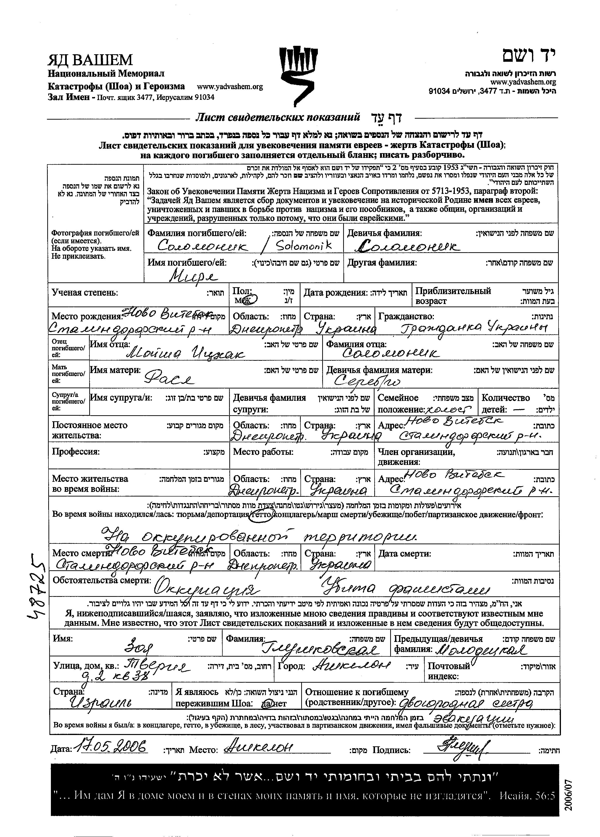 Mira Solomonik est née à Novo Vitebsk, Ukraine (URSS), fille de Itzkhak Moisha et de Rasl née Serebro. Elle était Célibataire. Avant la seconde guerre mondiale elle vivait à Novo Vitebsk, Ukraine (URSS). Pendant la guerre, elle était à Ghetto.