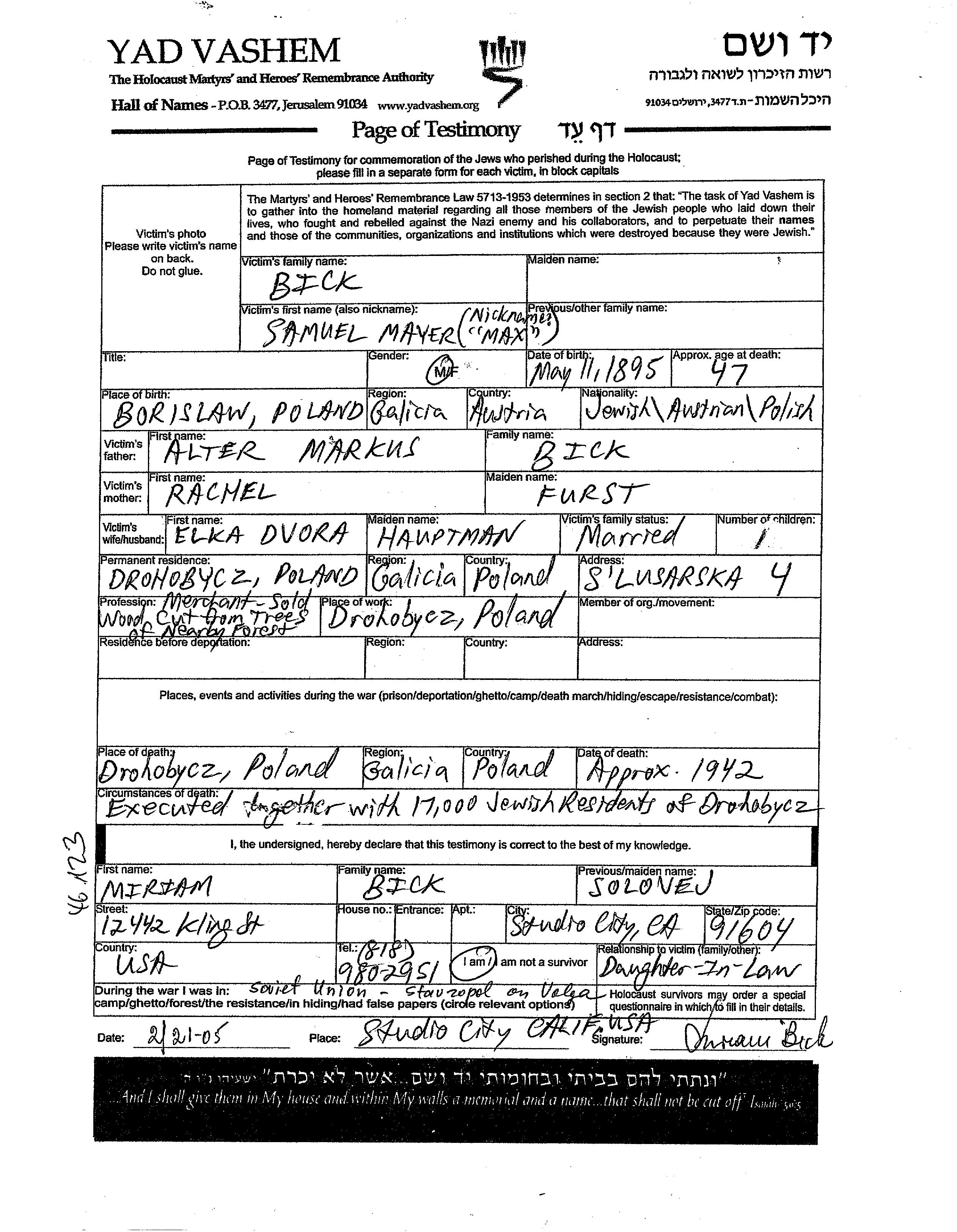 Samuel Mayer Max Bick est né à Boryslaw, Pologne en 1895, fils de Markus Alter et de Rachel née Furst. Il était Commerçant/e et Mariée à Dvora Elka née Hauptman. Avant la seconde guerre mondiale il vivait à Drohobycz, Pologne. Au cours de la guerre, il était à Drohobycz, Pologne.