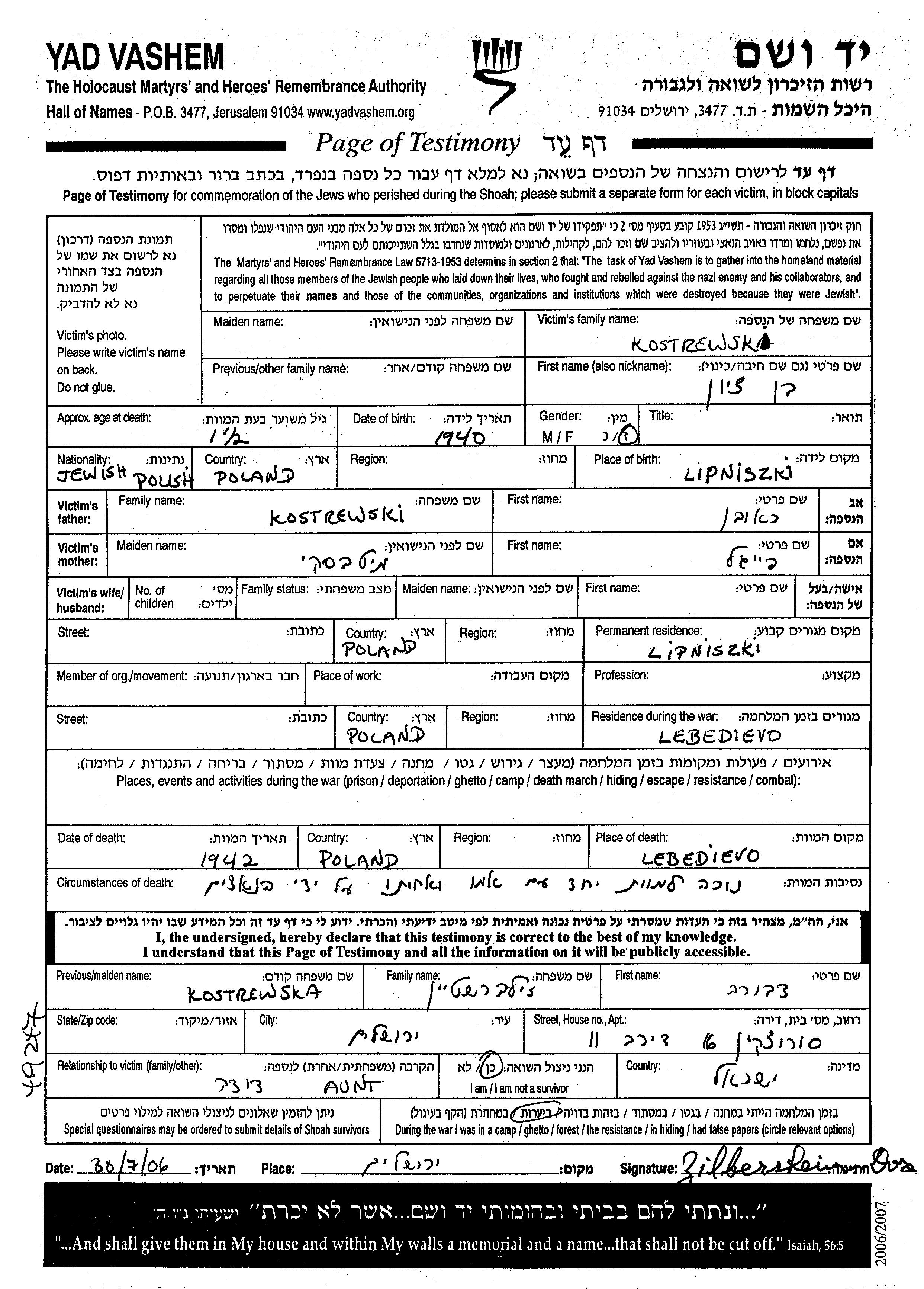 Kostrewski Bentzion 1940 Lipniszki, Pologne Feuille de témoignage
