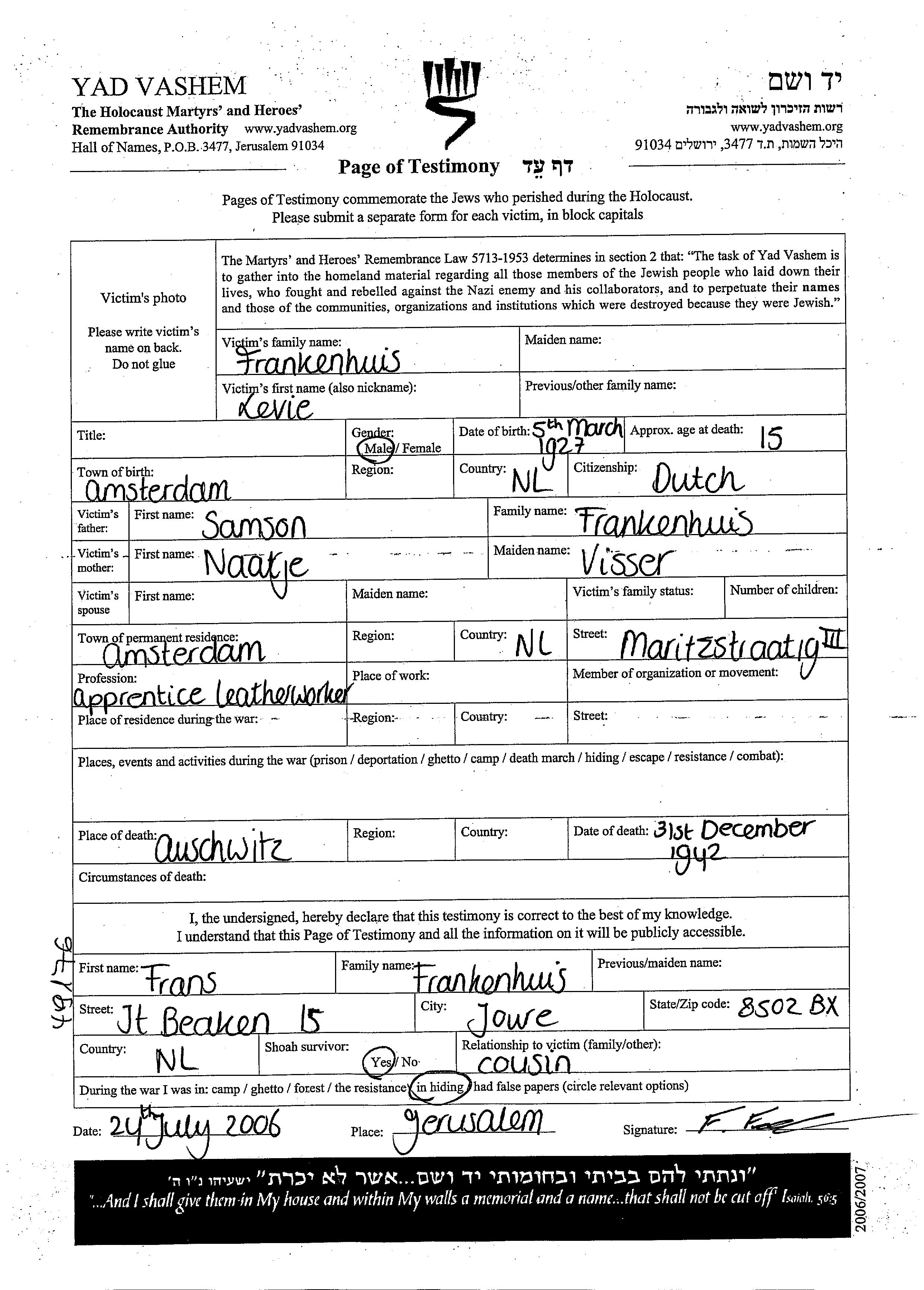 Frankenhuis Levie 1927 Amsterdam, Pays-Bas Feuille de témoignage