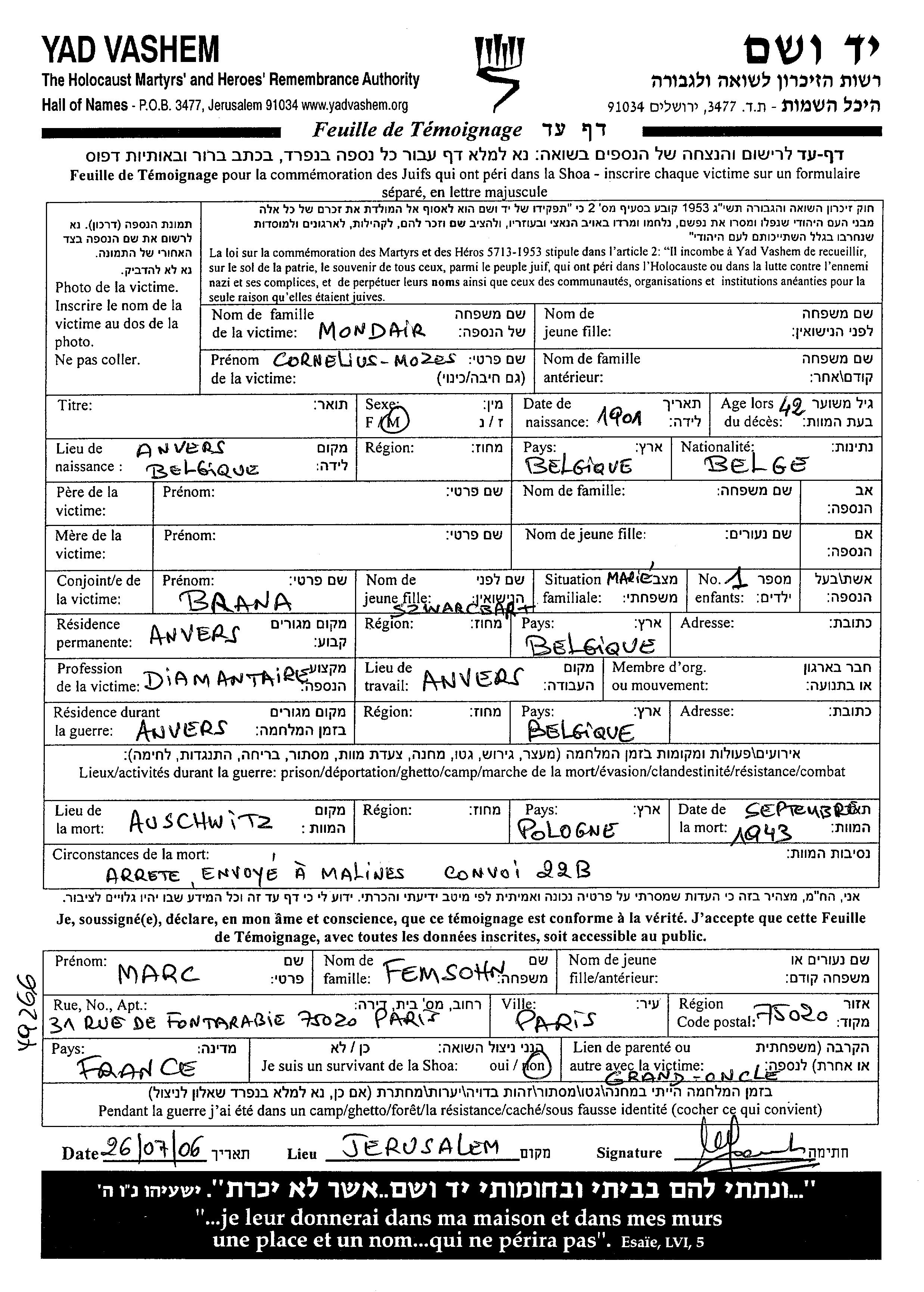 Mondair Mozes Cornelius 1901 Anvers, Belgique Feuille de témoignage
