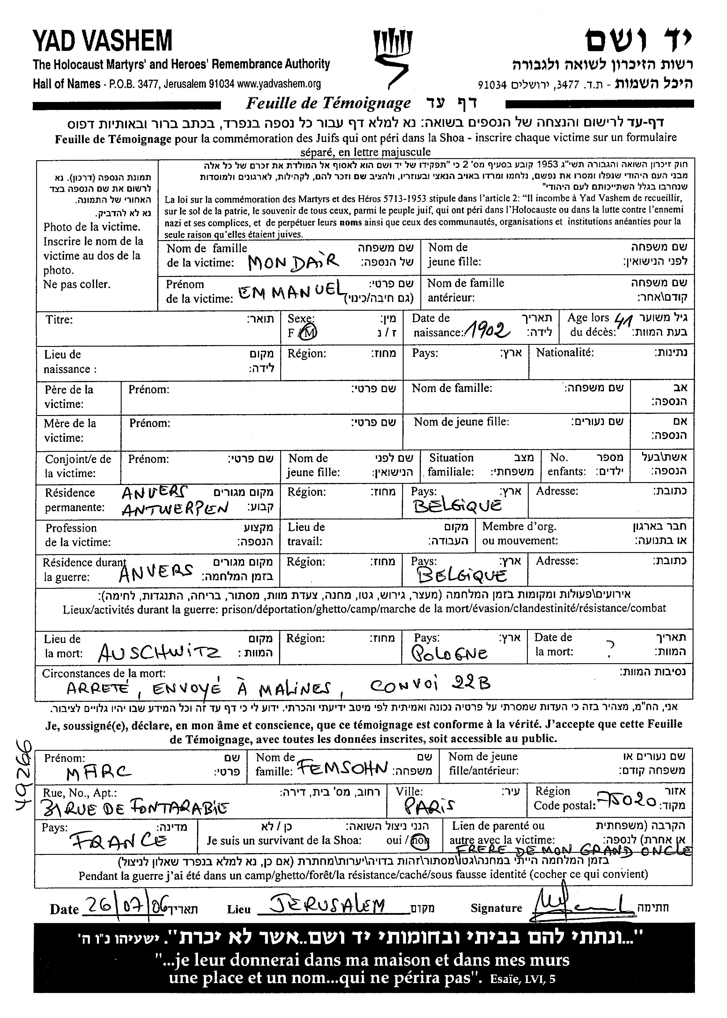 Yad Vashem - Pages of Testimony Names Memorial Collection