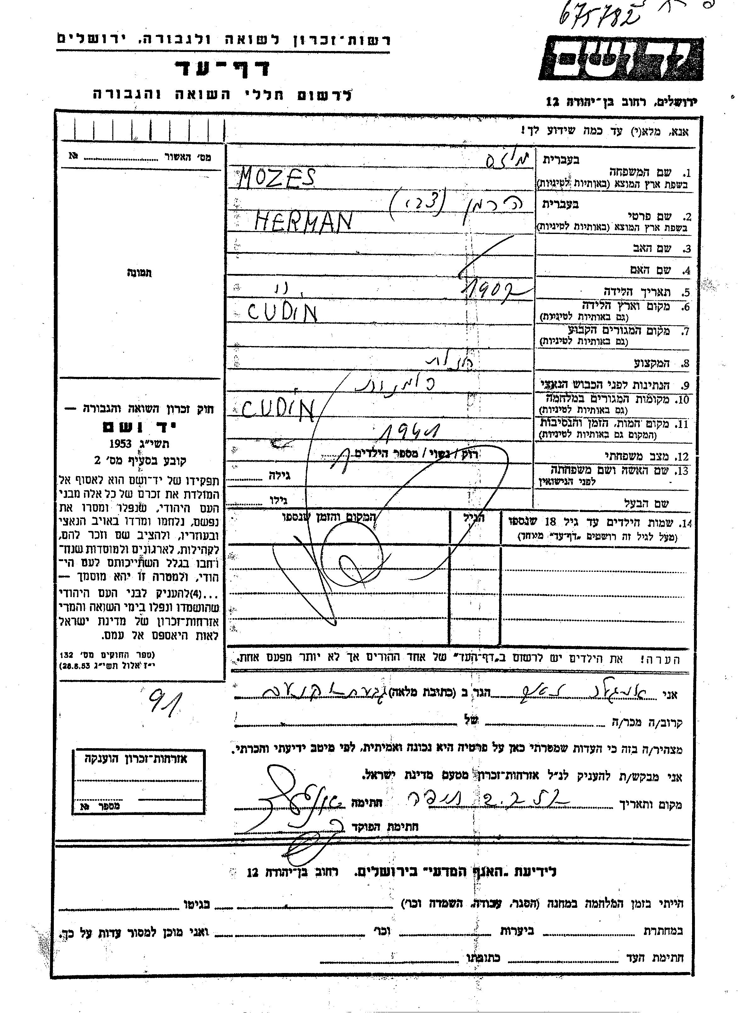 Mozes Herman Tzvi 1907 endroit inconnu, Feuille de témoignage