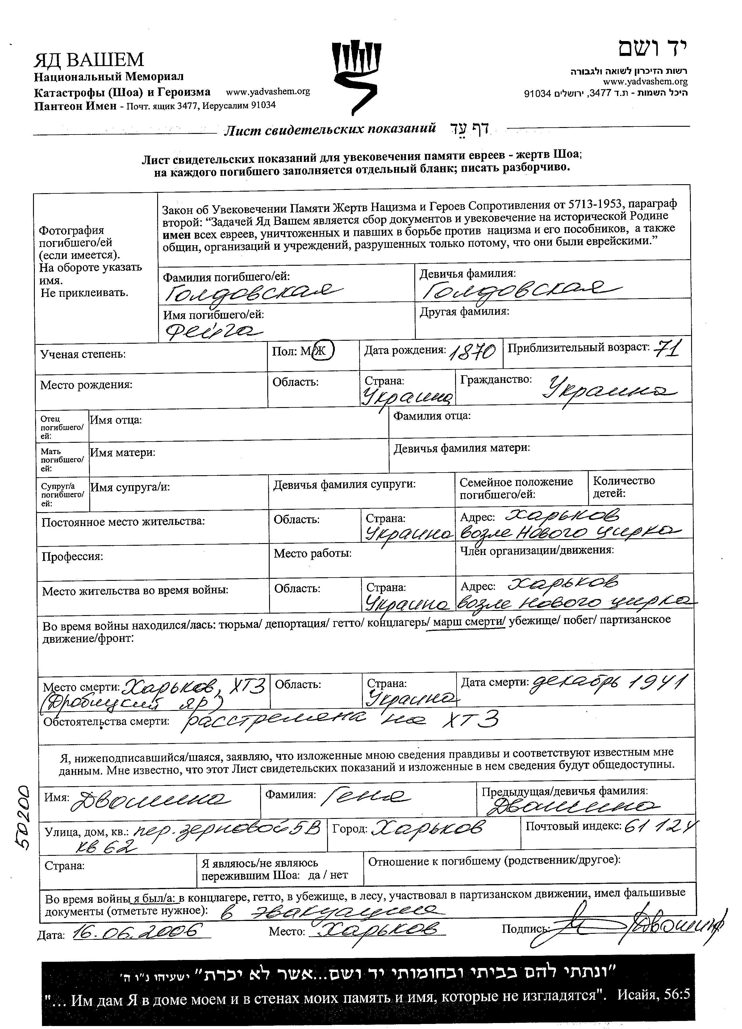 Goldovskaya Feiga 1870 Kharkov, Ukraine (URSS) Feuille de témoignage