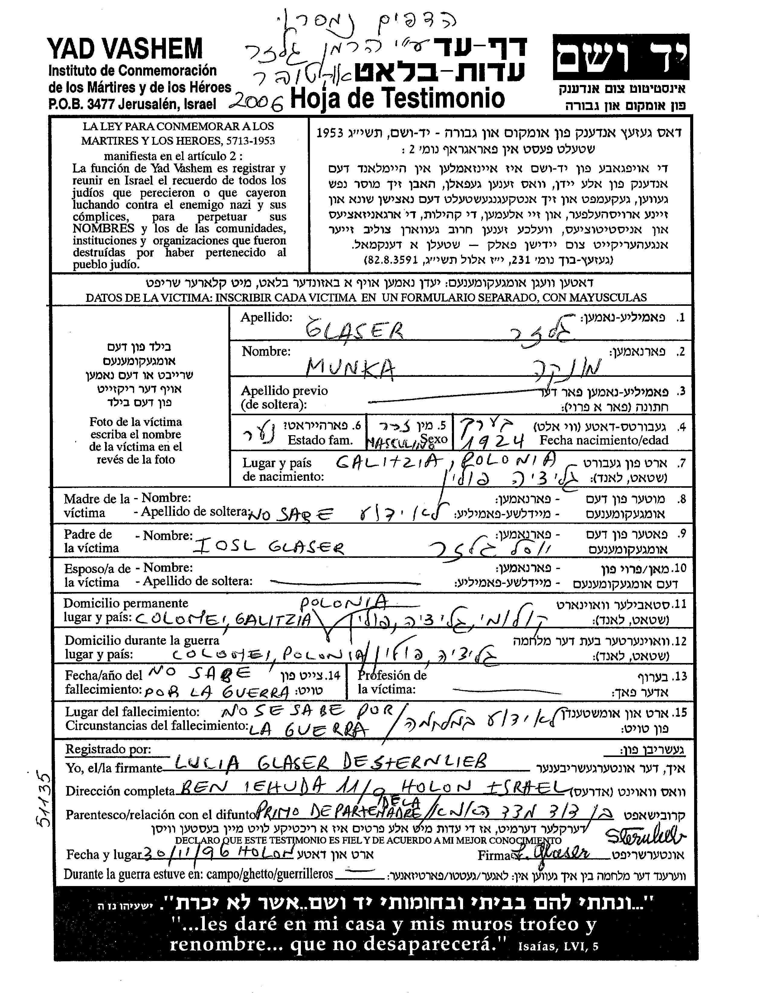 Glazer Munka 1924 Kolomyja, Pologne Feuille de témoignage