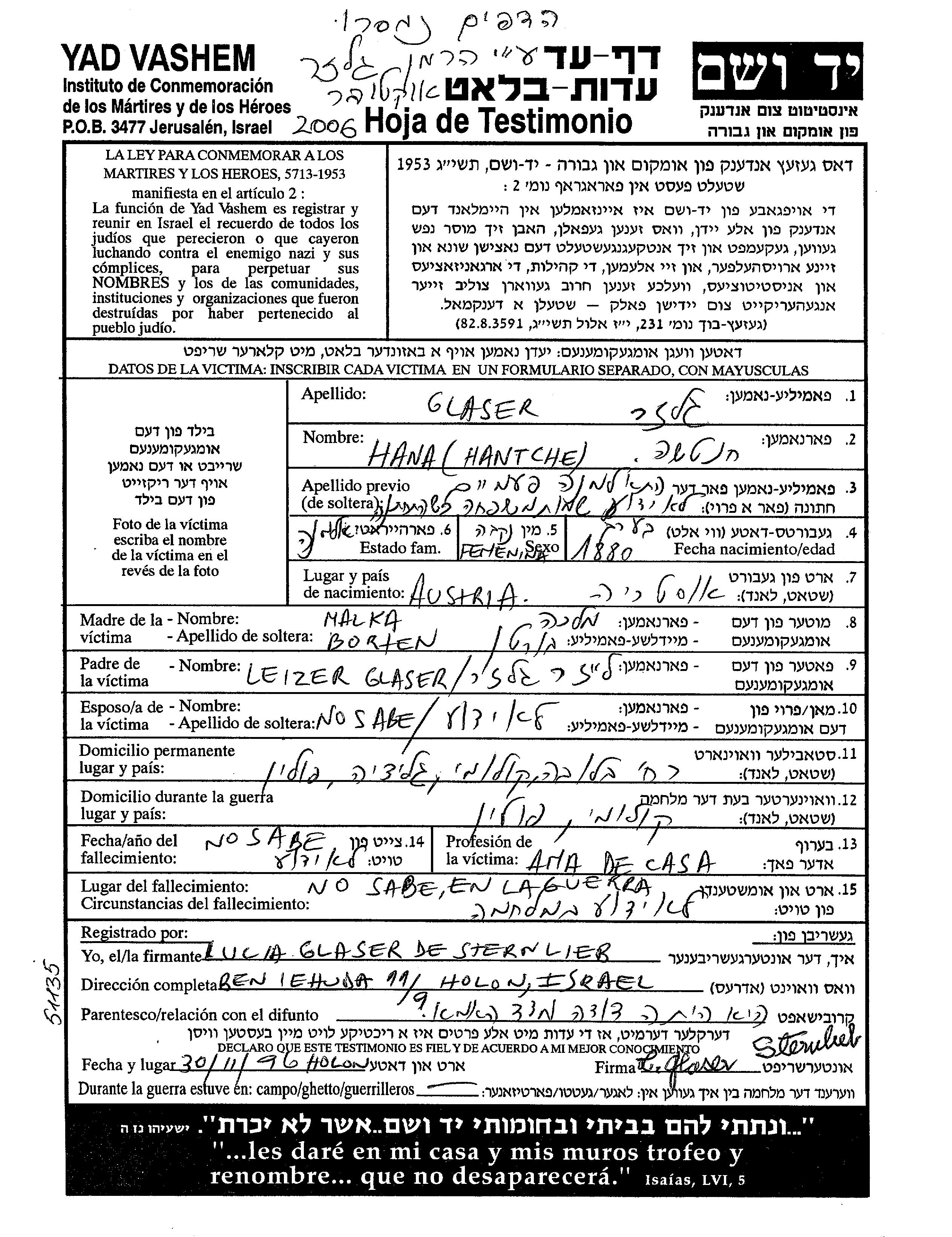 Khana Glazer est née à Autriche en 1880, fille de Leizer et de Malka née Borten. Elle était Femme au foyer et veuve. Avant la seconde guerre mondiale elle vivait à Kolomia, Pologne. Pendant la guerre, elle était à Kolomia, Pologne.