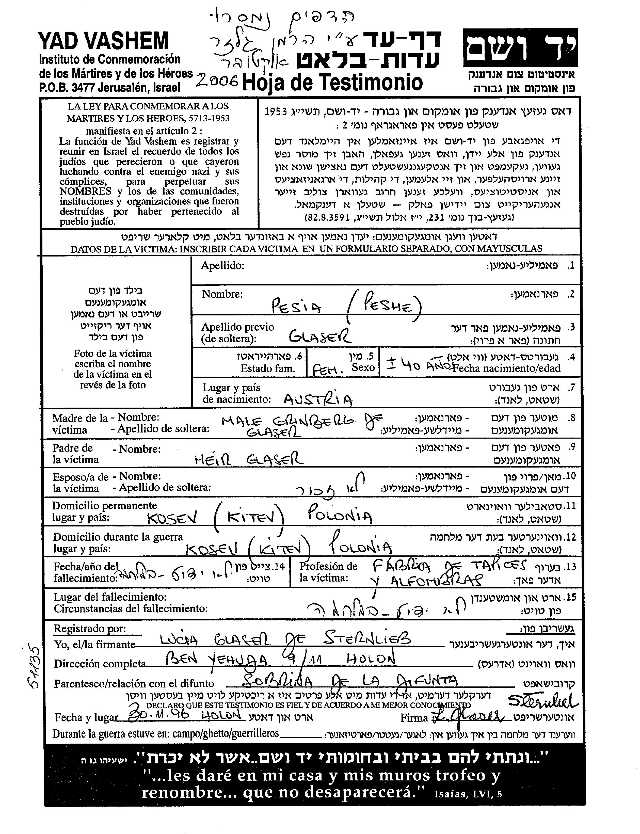 Pesia nom inconnu née Glaser est née à Autriche, fille de Meir et de Male née Grinberg. Elle était Mariée. Avant la seconde guerre mondiale elle vivait à Kosev, Pologne. Pendant la guerre, elle était à Kosev, Pologne.