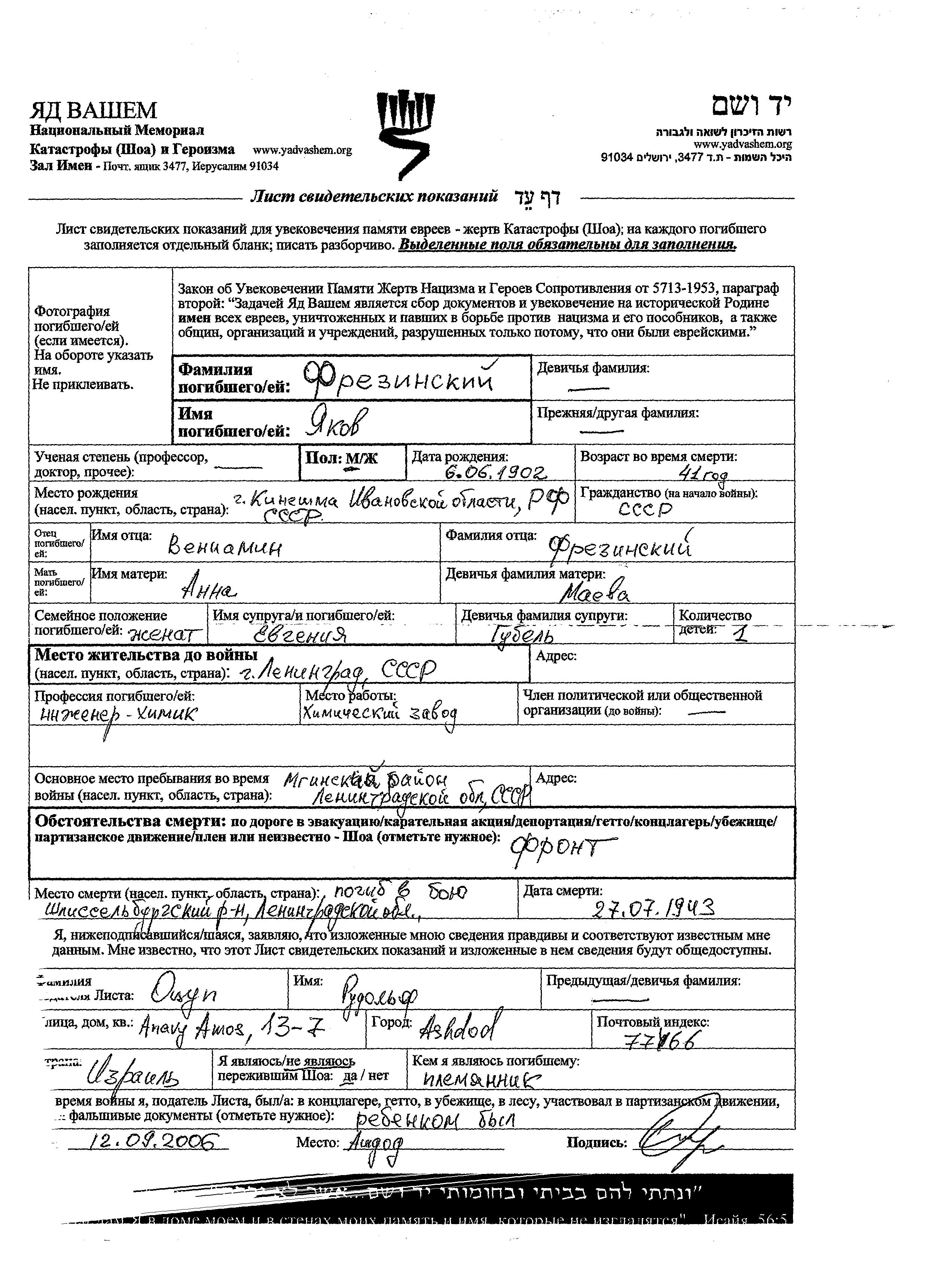 Frezinski Yakov 1902 Leningrad, Russie (URSS) Feuille de témoignage