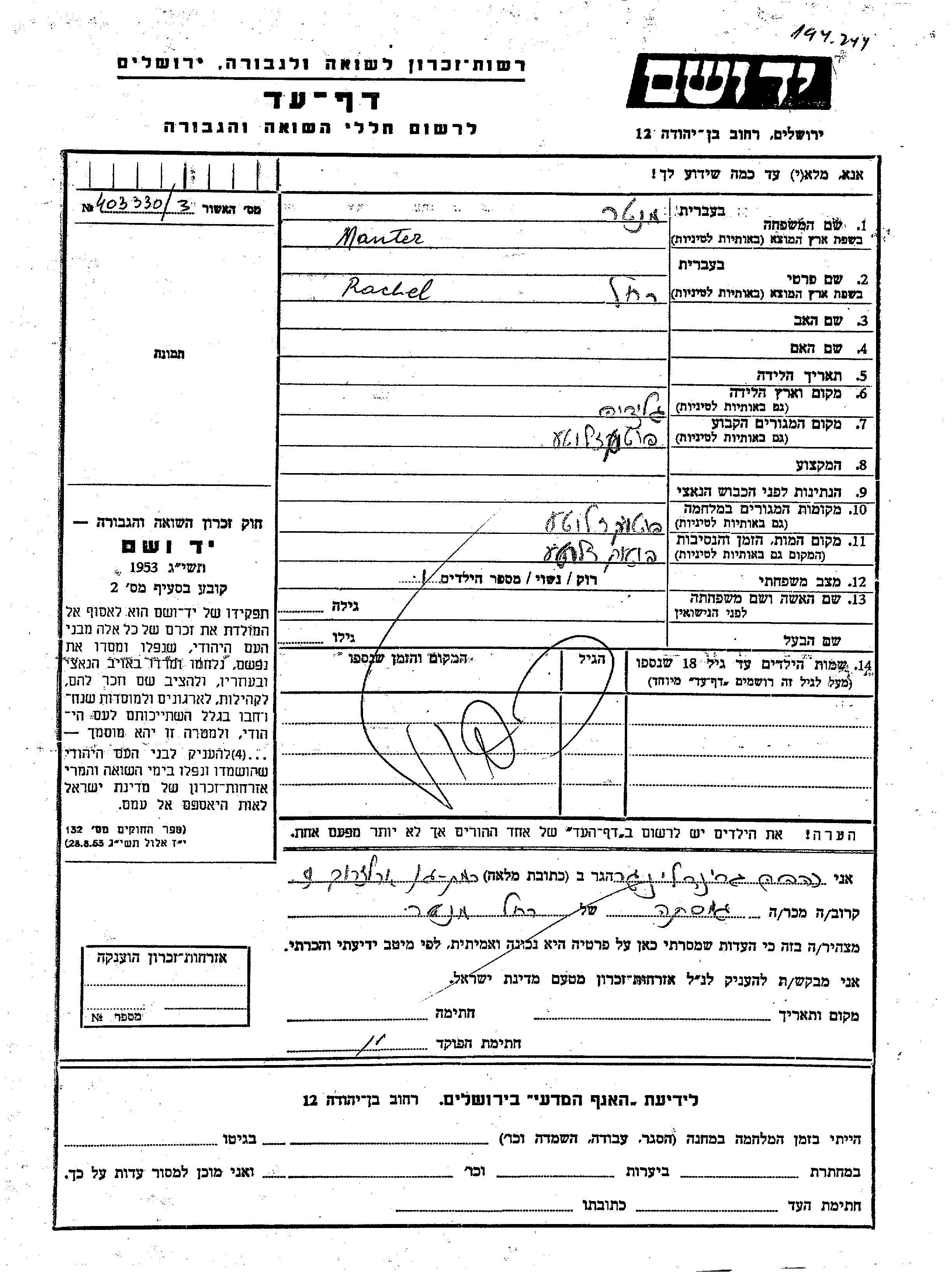Manter Rachel Potok Zloty, Pologne Feuille de témoignage