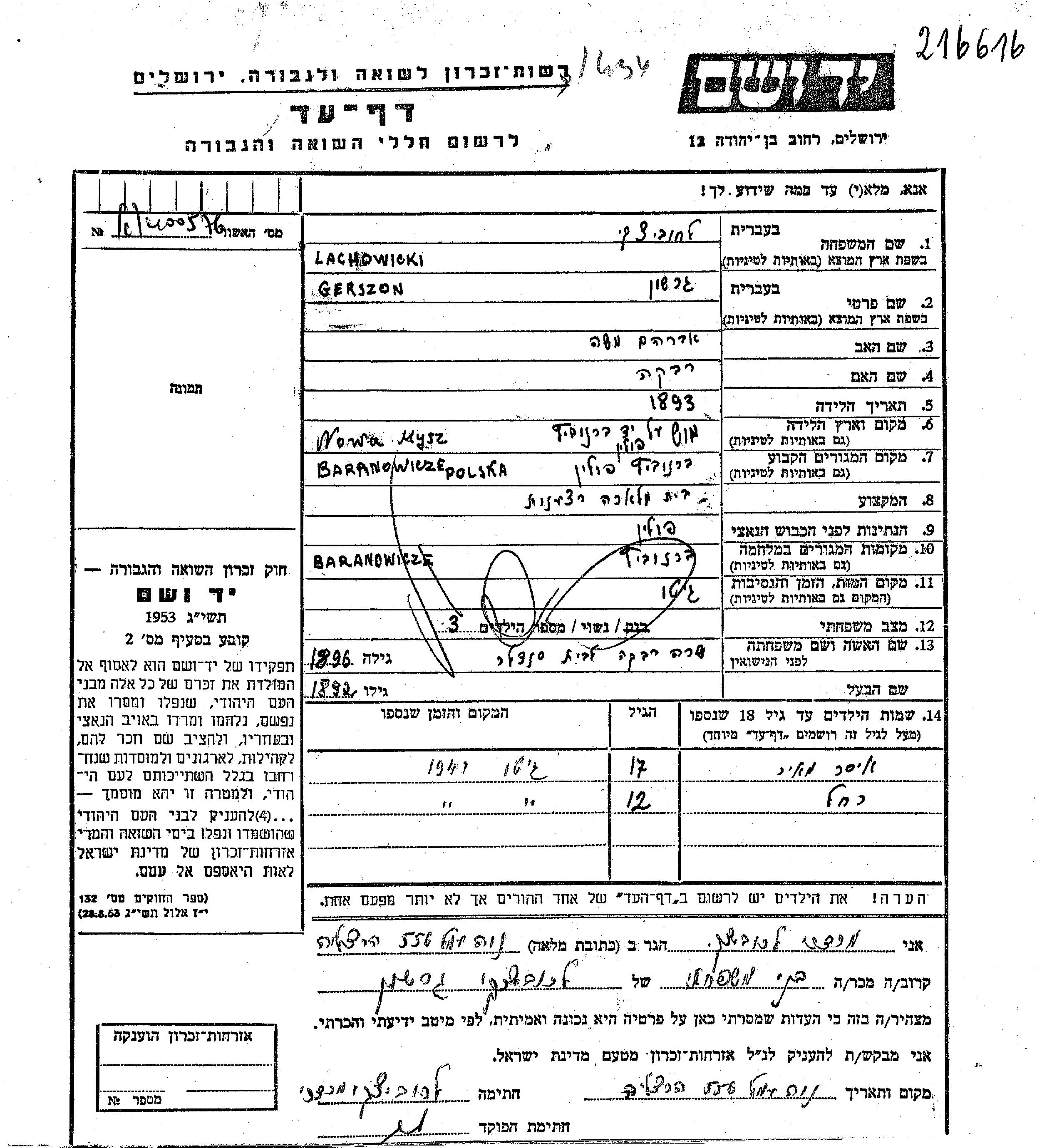 Lachowicki Gerszon 1893 Baranowicz, Pologne Feuille de témoignage