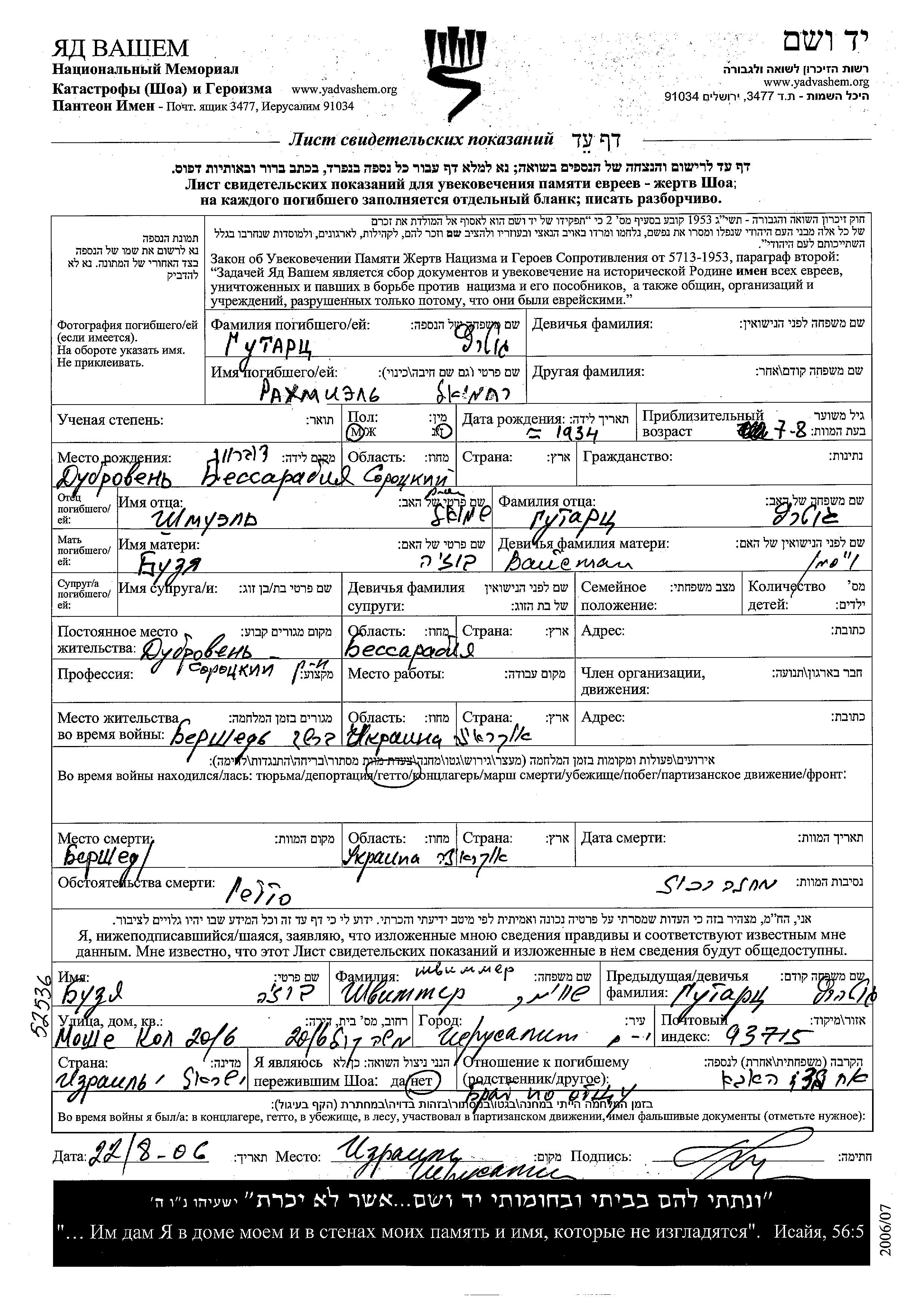 Yad Vashem - Pages of Testimony Names Memorial Collection