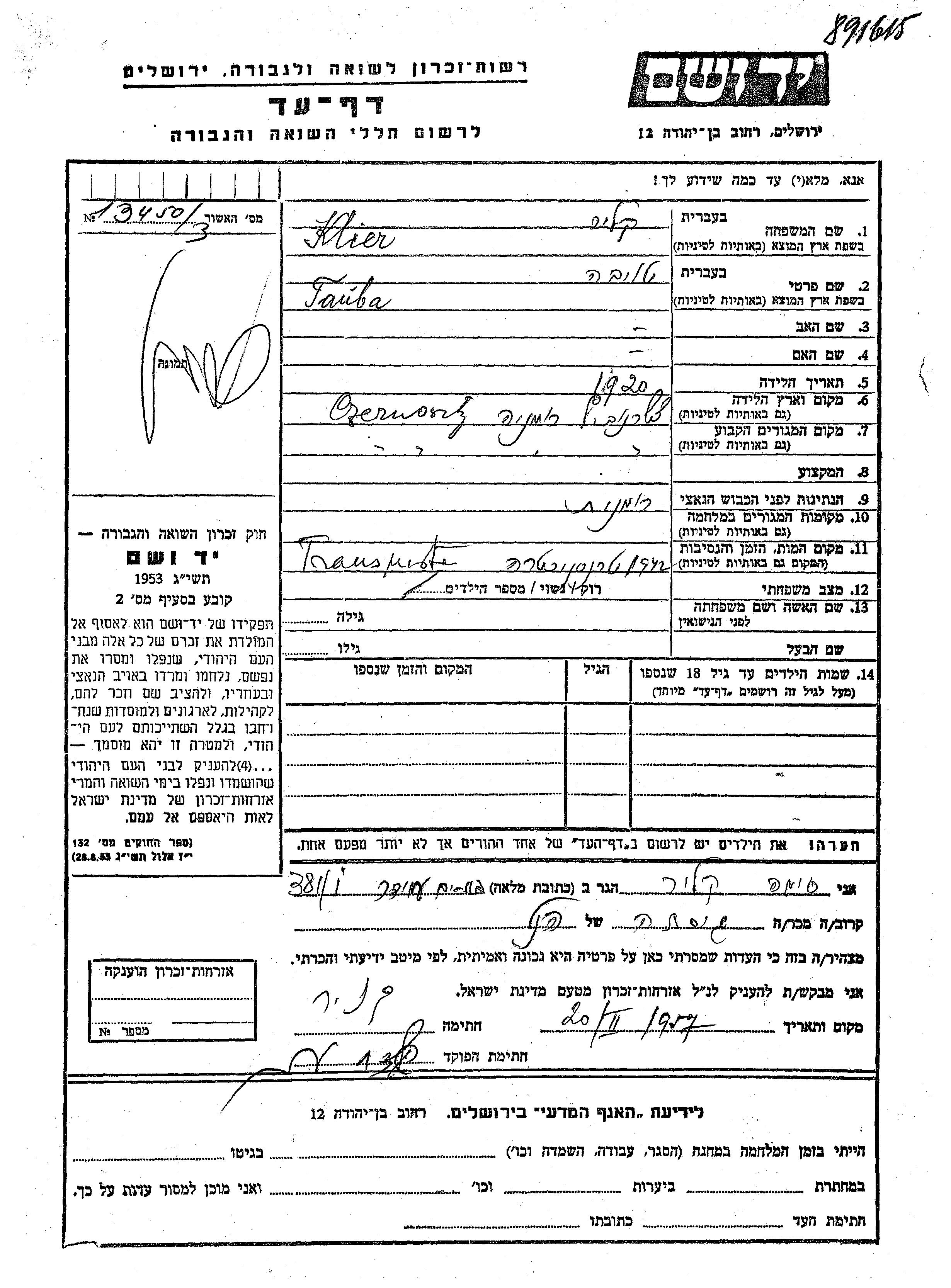 Yad Vashem - Pages of Testimony Names Memorial Collection