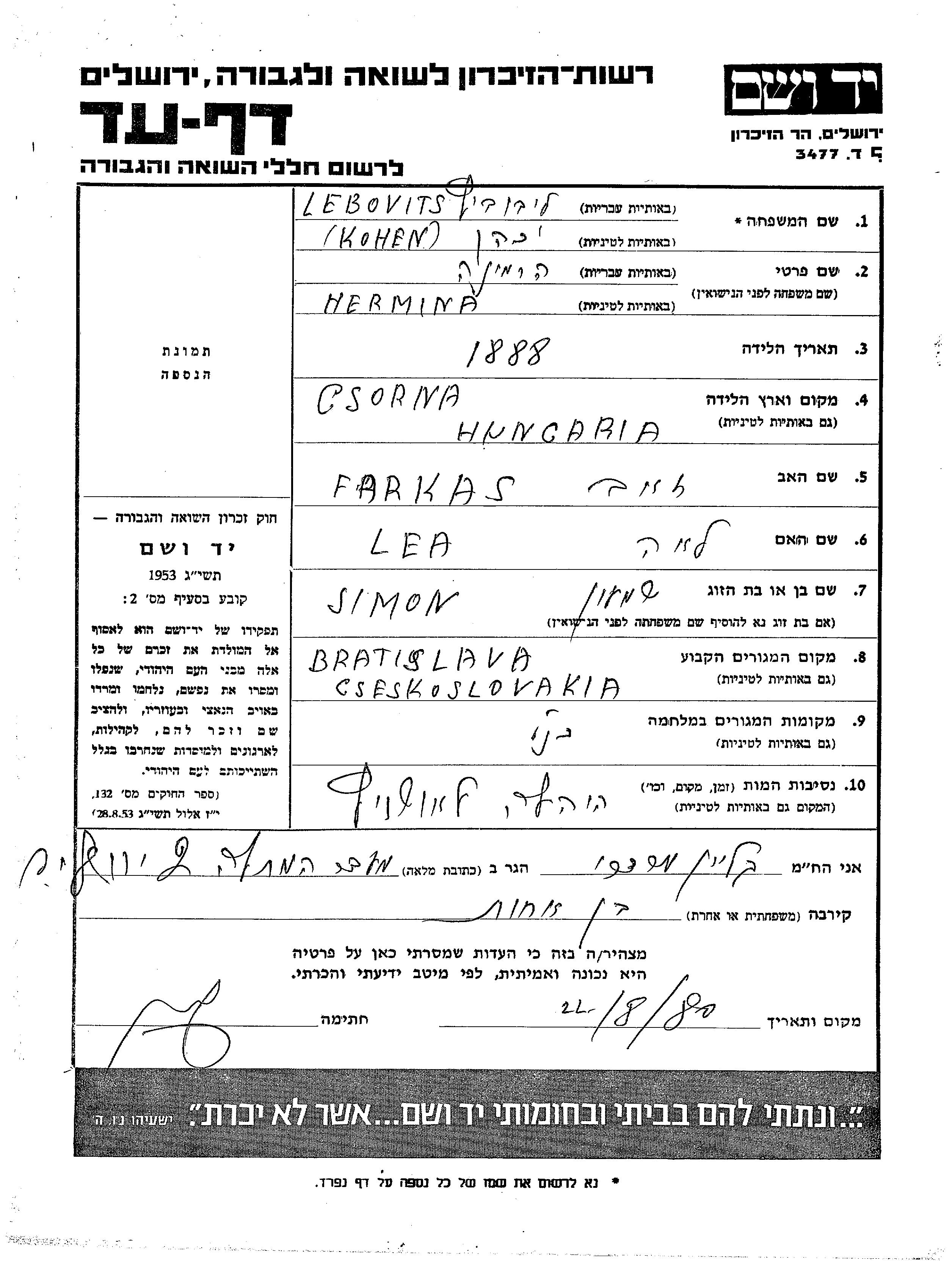 Lebovits Hermina 1888 Bratislava, Tchécoslovaquie Feuille de témoignage