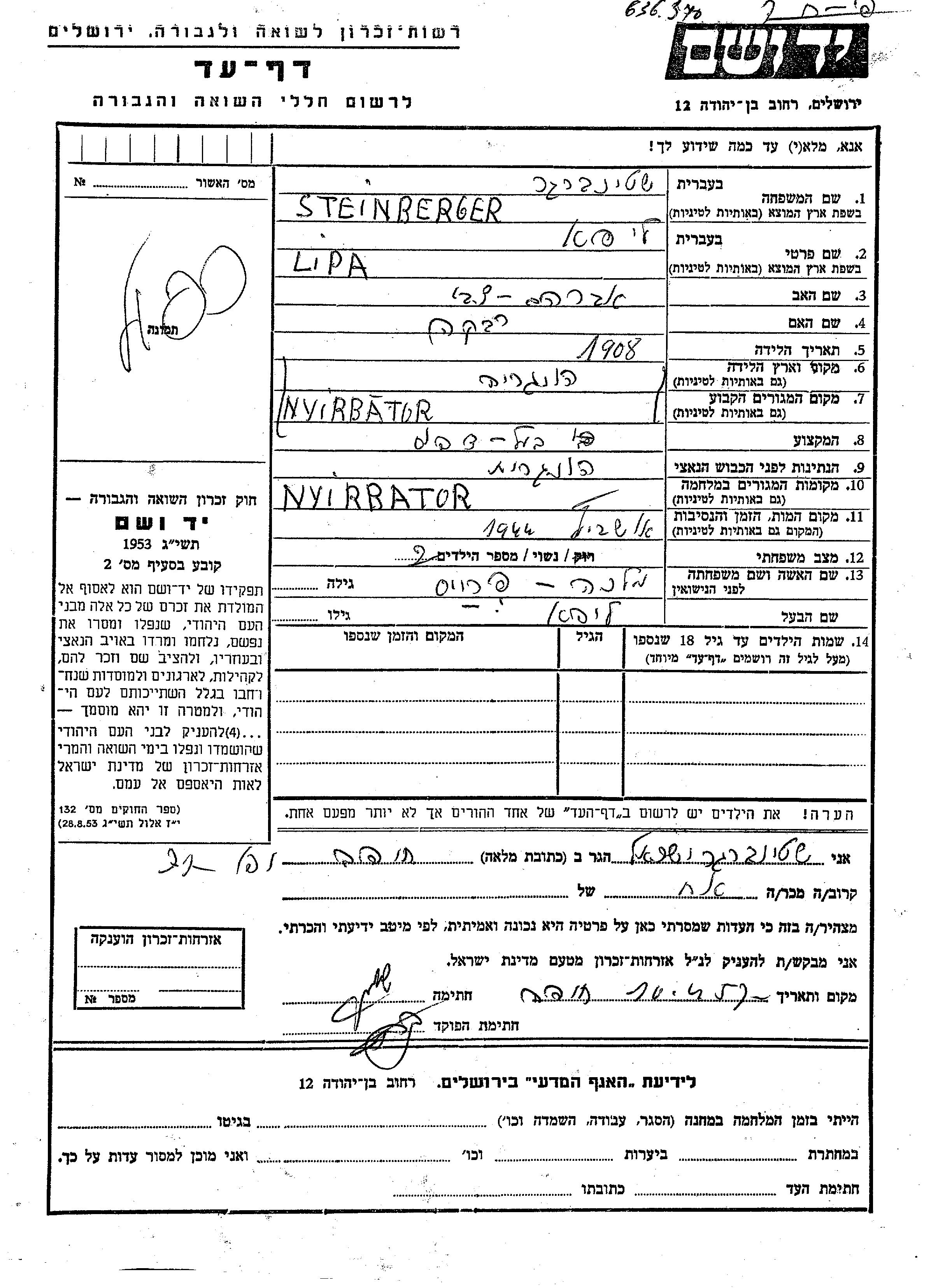 Lipa Steinberger est né à Nyirbator, Hongrie en 1908, fils de Avraham Tzvi et de Rivka. Il était Propriétaire d'une imprimerie et Mariée à Malka née Preis. Avant la seconde guerre mondiale il vivait à Nyirbator, Hongrie. Au cours de la guerre, il était à Nyirbator, Hongrie.