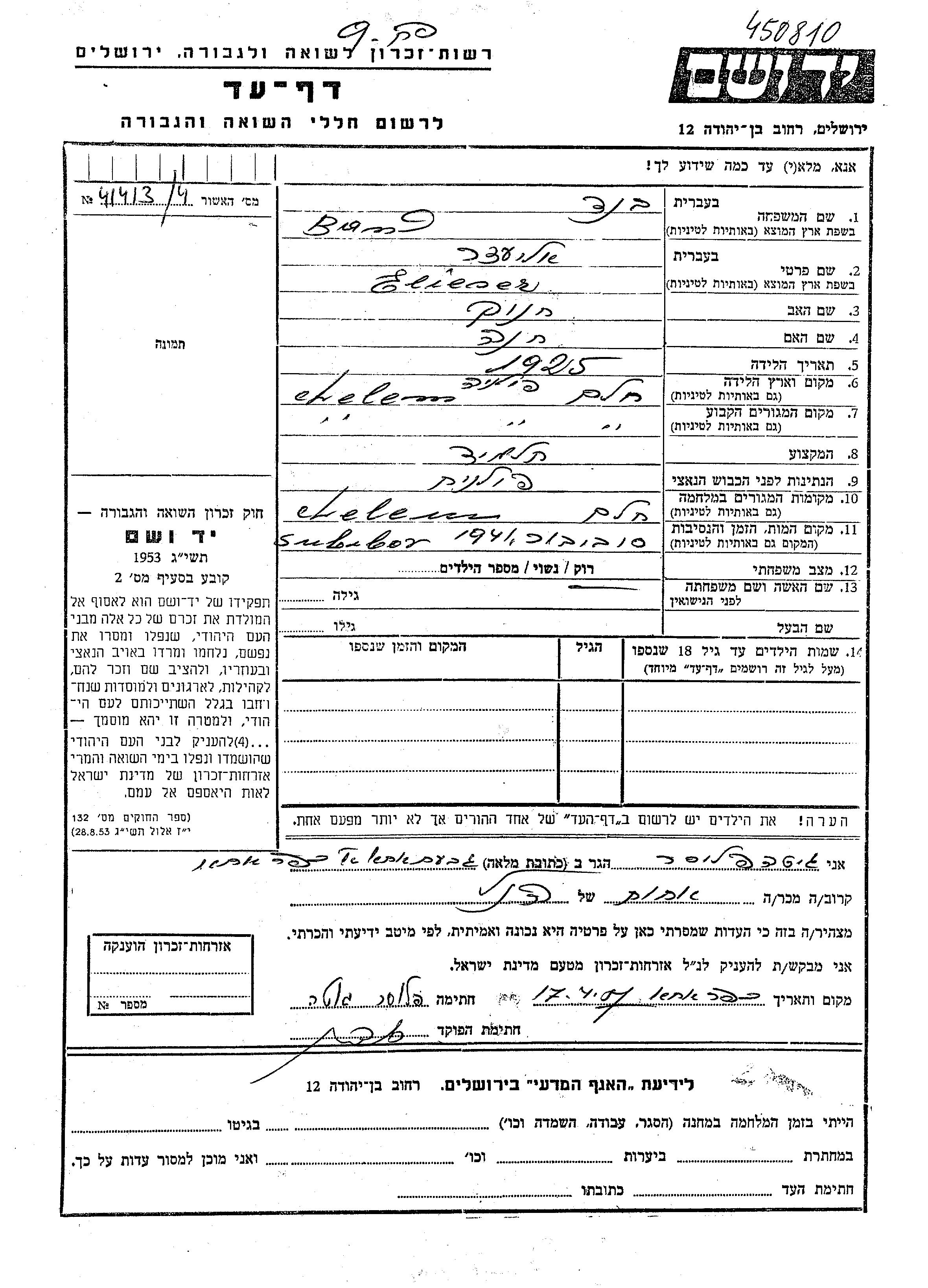 Elieser a été assassiné pendant la Shoah. Lieu de la mort: Subibor, Pologne en 1941.