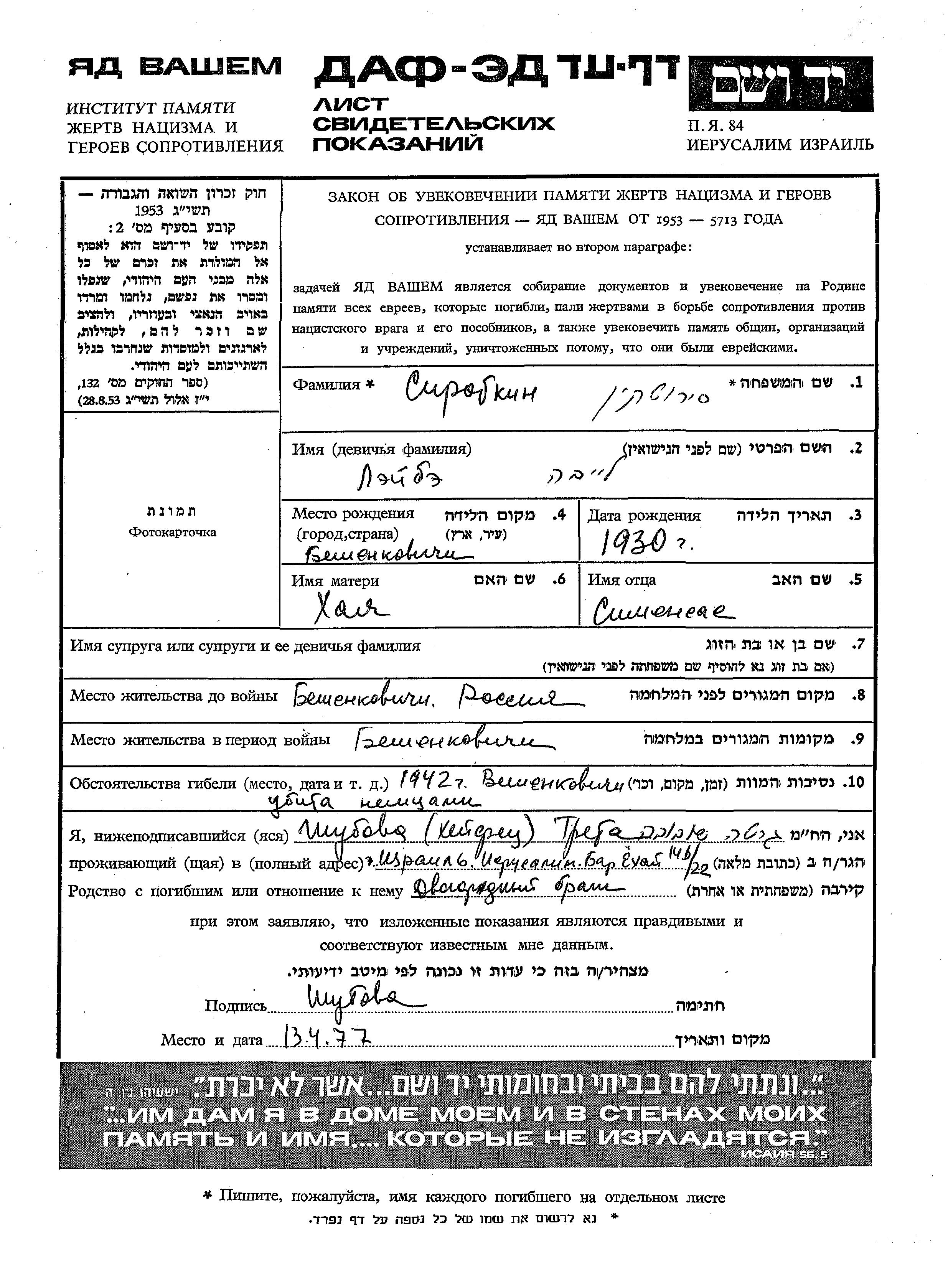 Sirotkin Leibe 1930 Beshenkowitschi, Bélorussie (URSS) Feuille de témoignage