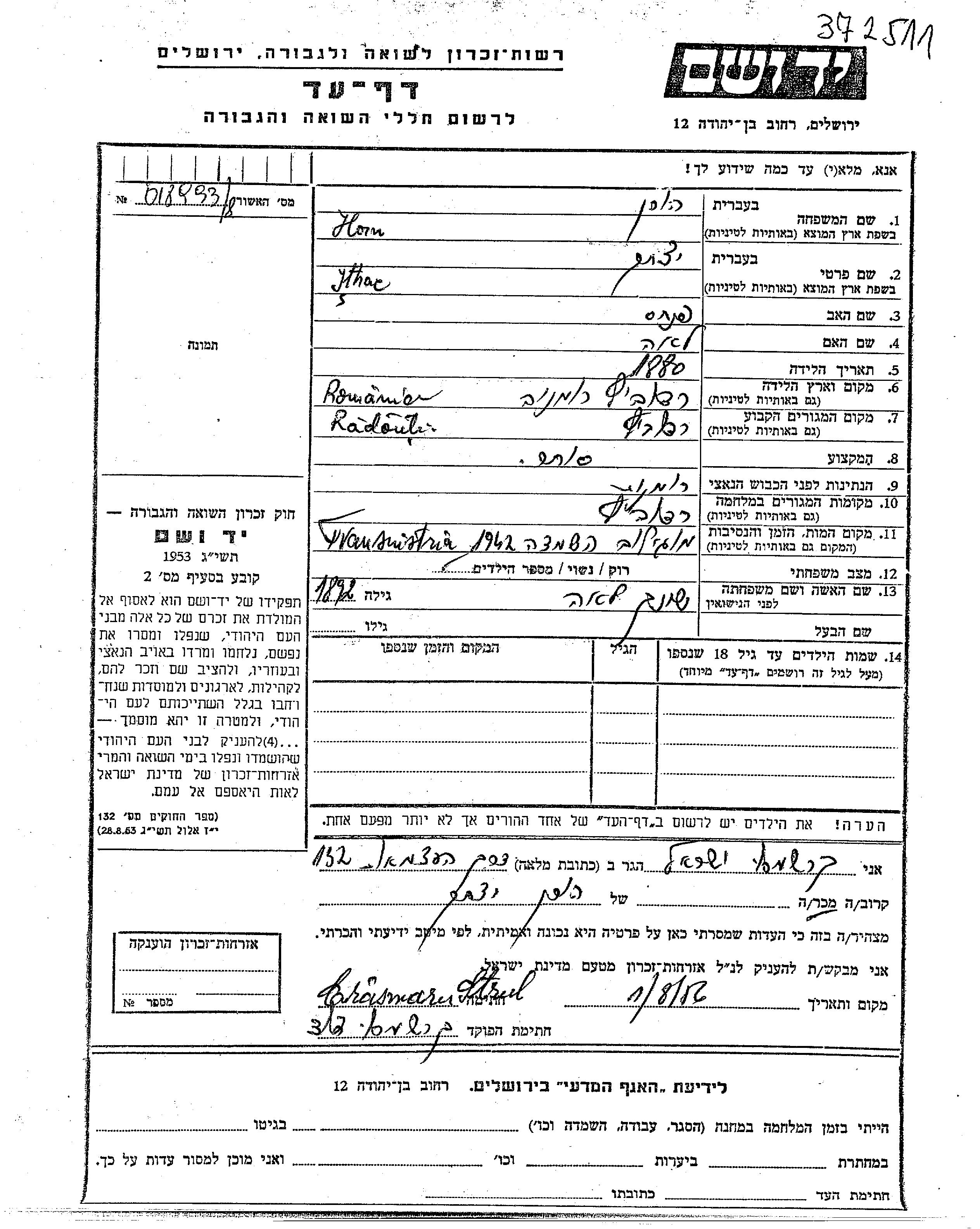 Ythac Horn est né à Radauti, Roumanie en 1880, fils de Pinkhas et de Lea. Il était Commerçant/e et Mariée à Lea née Shink. Avant la seconde guerre mondiale il vivait à Radauti, Roumanie. Au cours de la guerre, il était à Radauti, Roumanie.