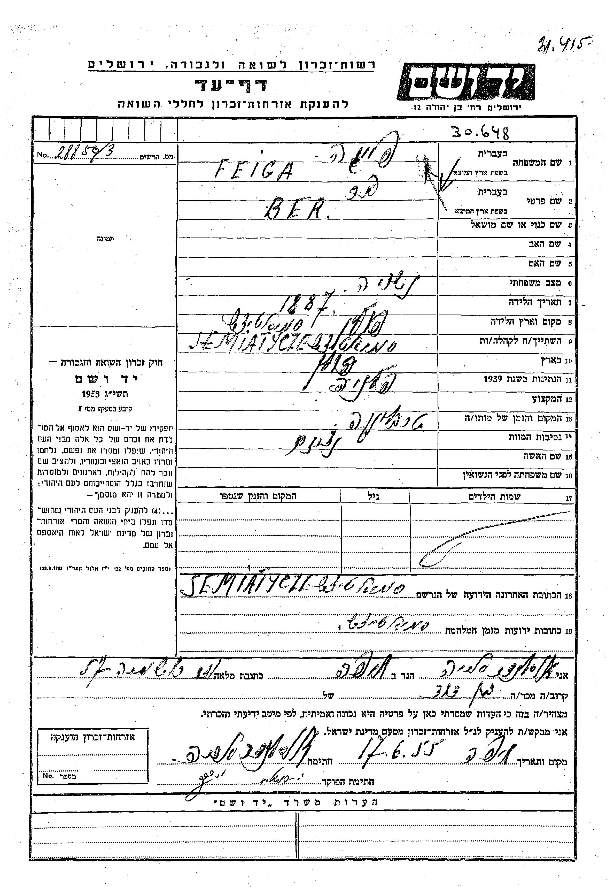 Ber Feiga 1887 Siemiatycze, Pologne Feuille de témoignage
