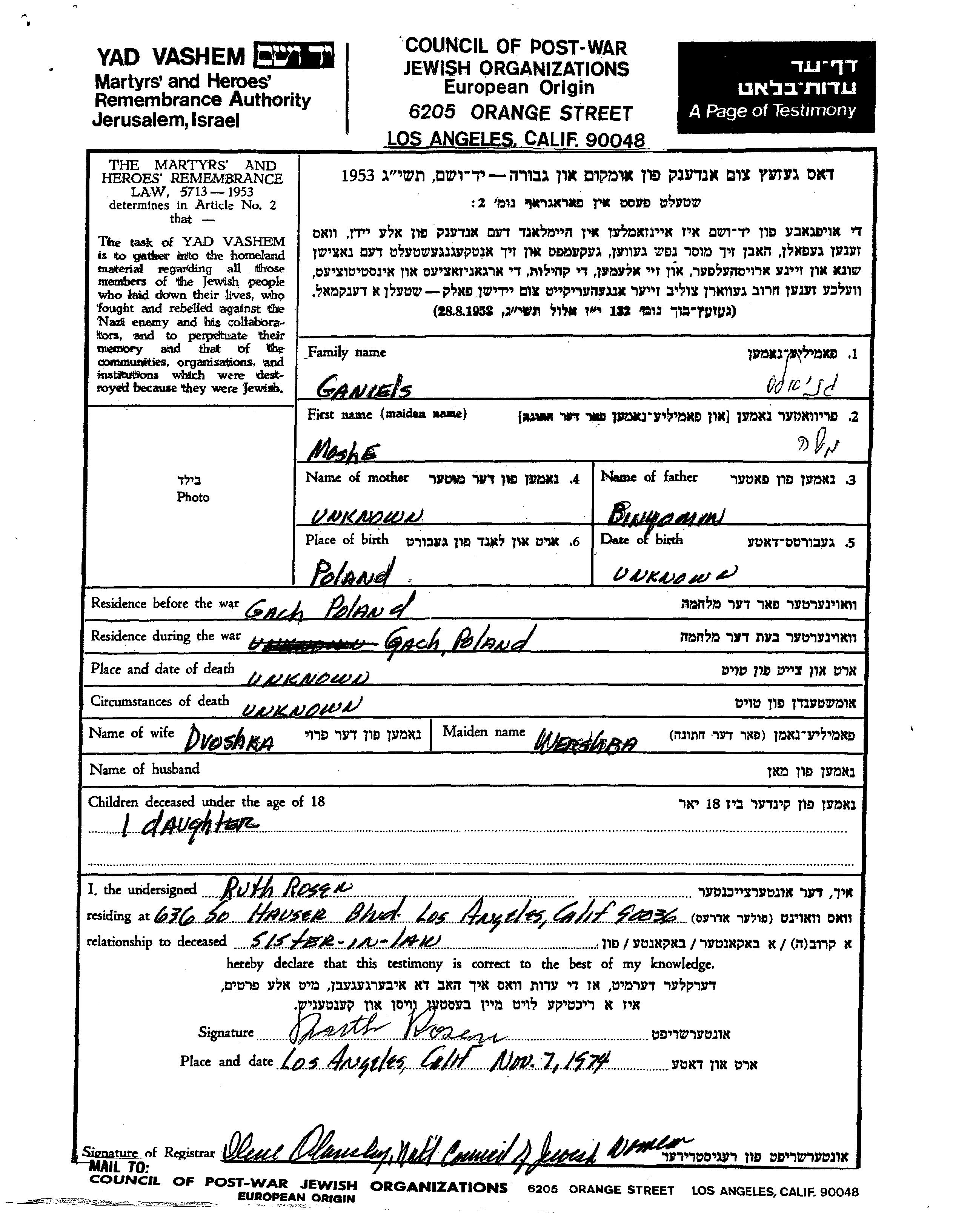 Ganiels Moshe Gac, Pologne Feuille de témoignage