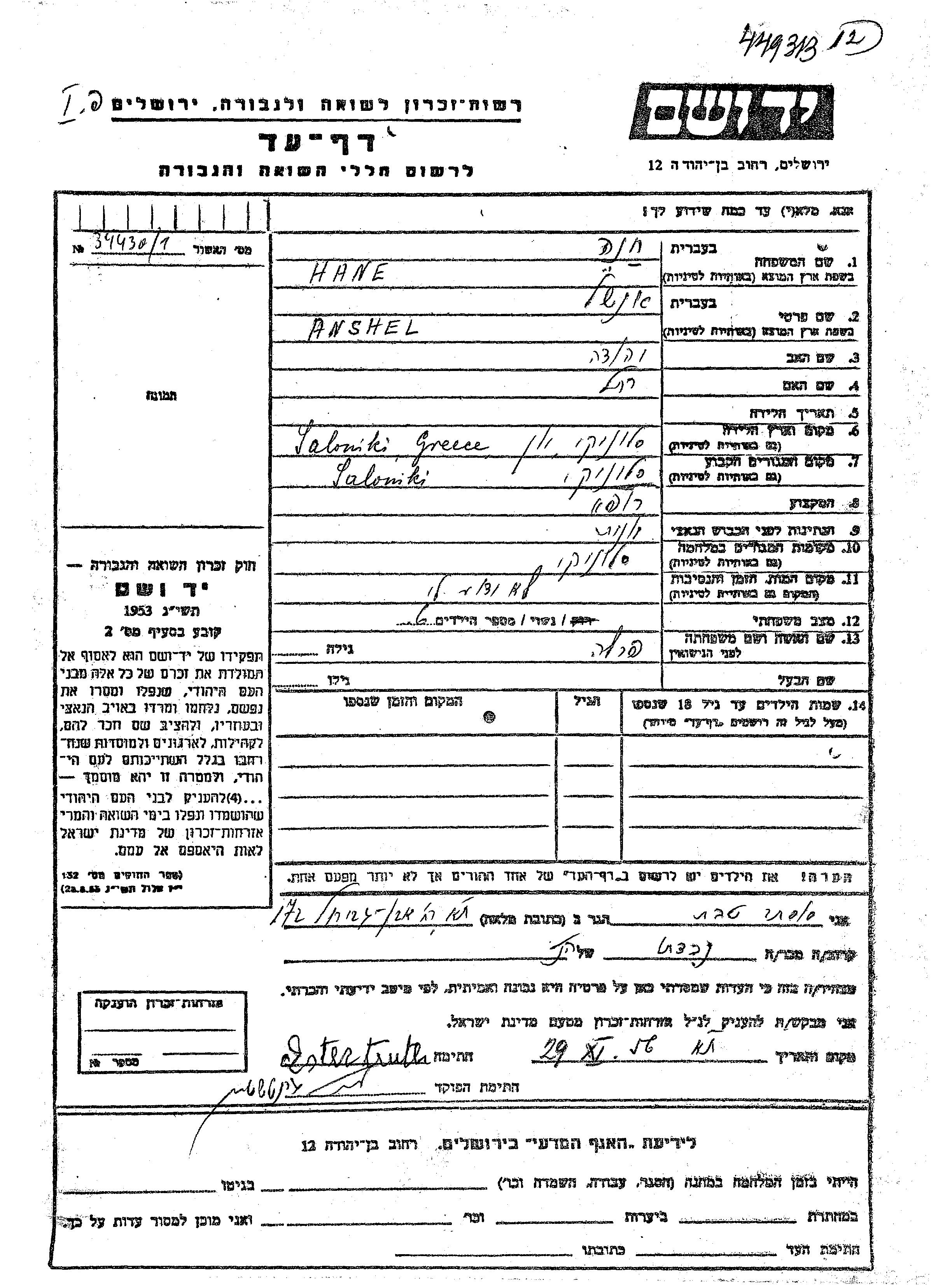 Anshel Hane est né à Saloniki, Grèce, fils de Yehuda et de Rakhel. Il était Médecin et Mariée à Perla. Avant la seconde guerre mondiale il vivait à Grèce. Au cours de la guerre, il était à Saloniki, Grèce.