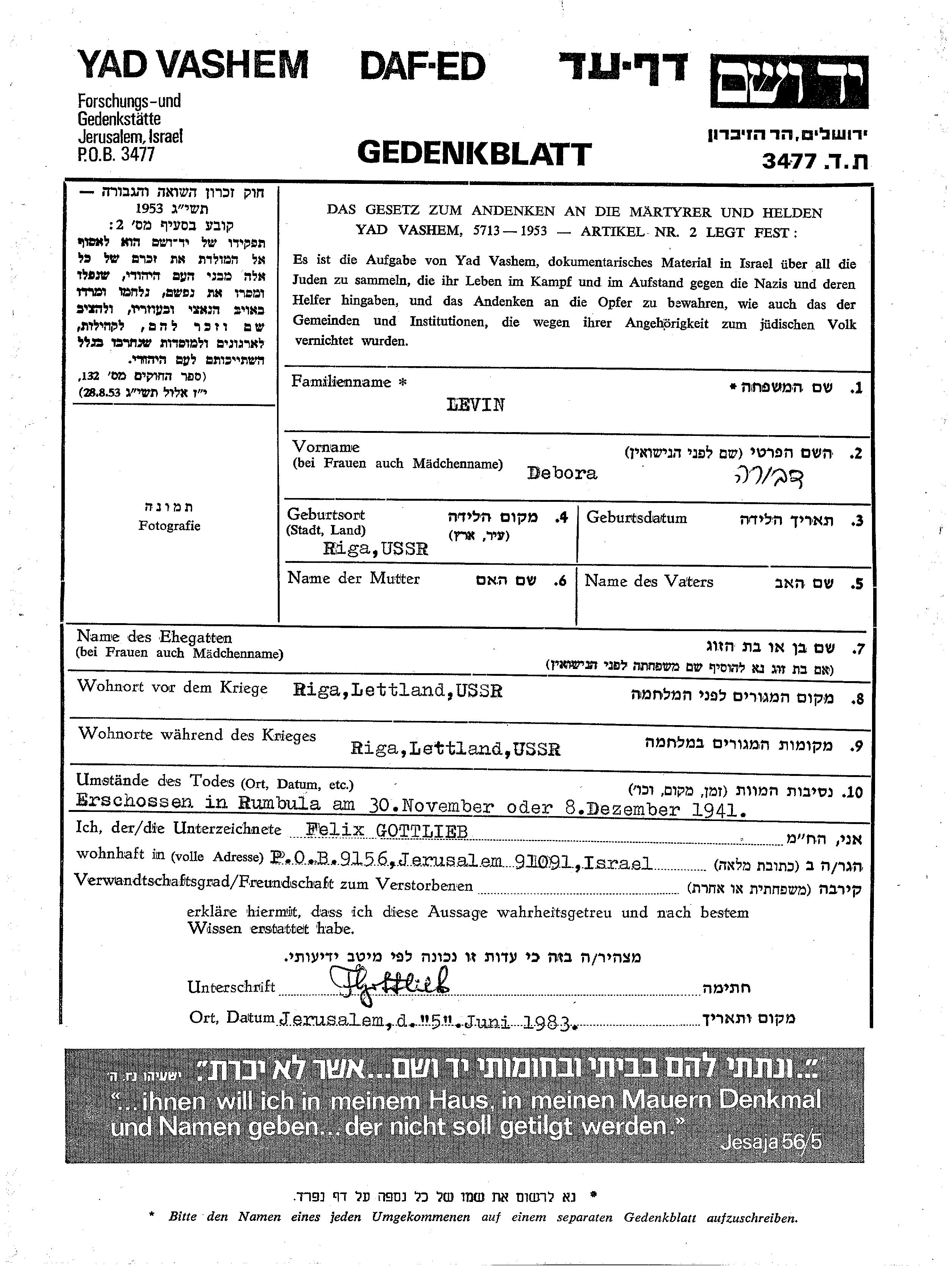 Levin Debora Riga, Lettonie Feuille de témoignage