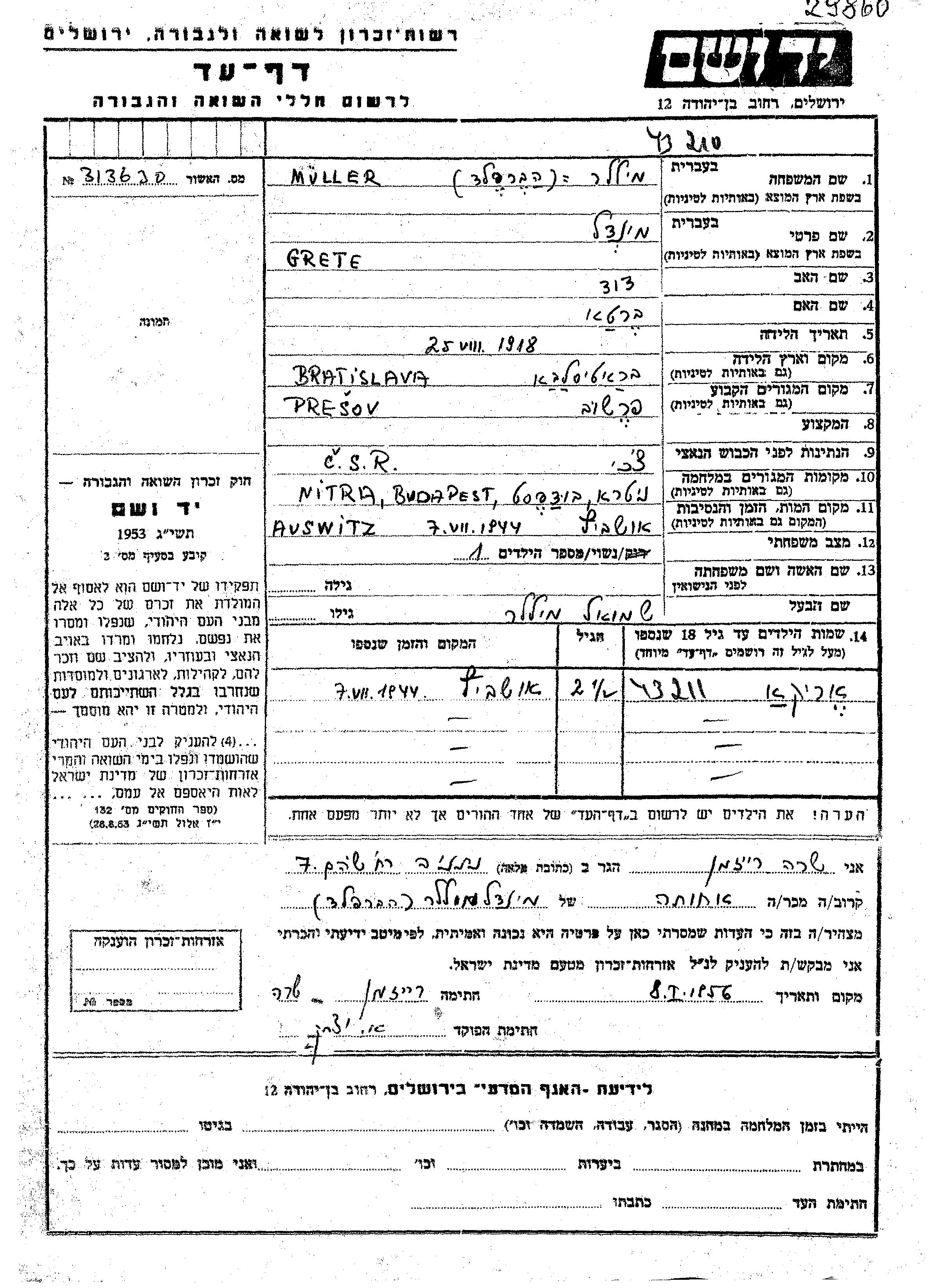 Muller Grete Mindl 1918 Presov, Tchécoslovaquie Feuille de témoignage