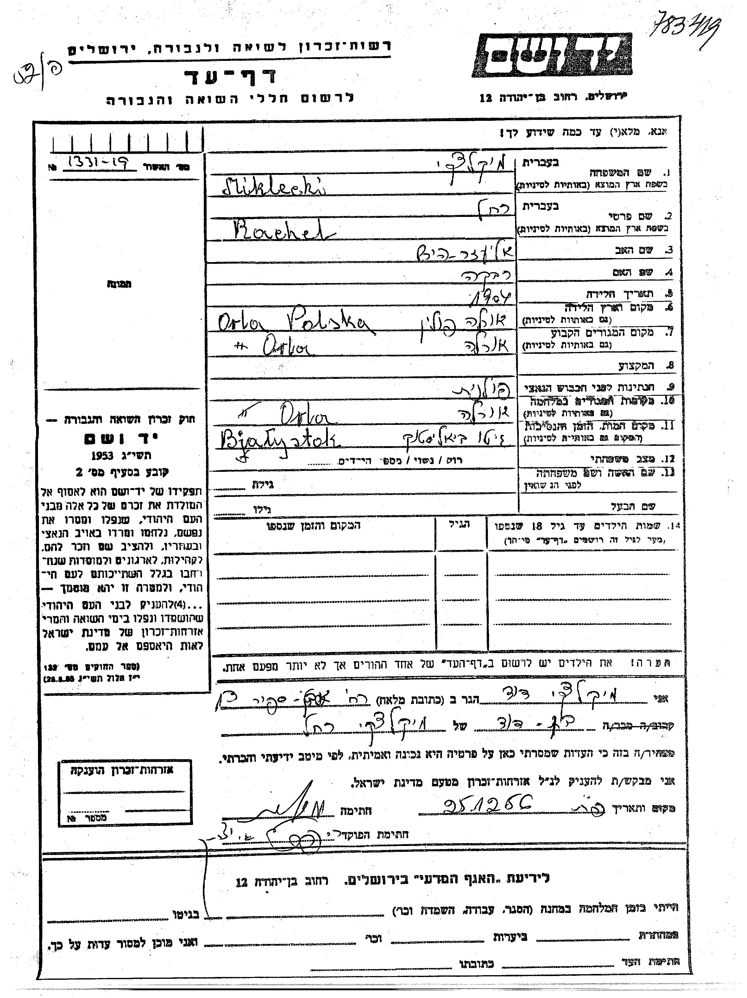 Miklecki Rachel 1904 Orla, Pologne Feuille de témoignage