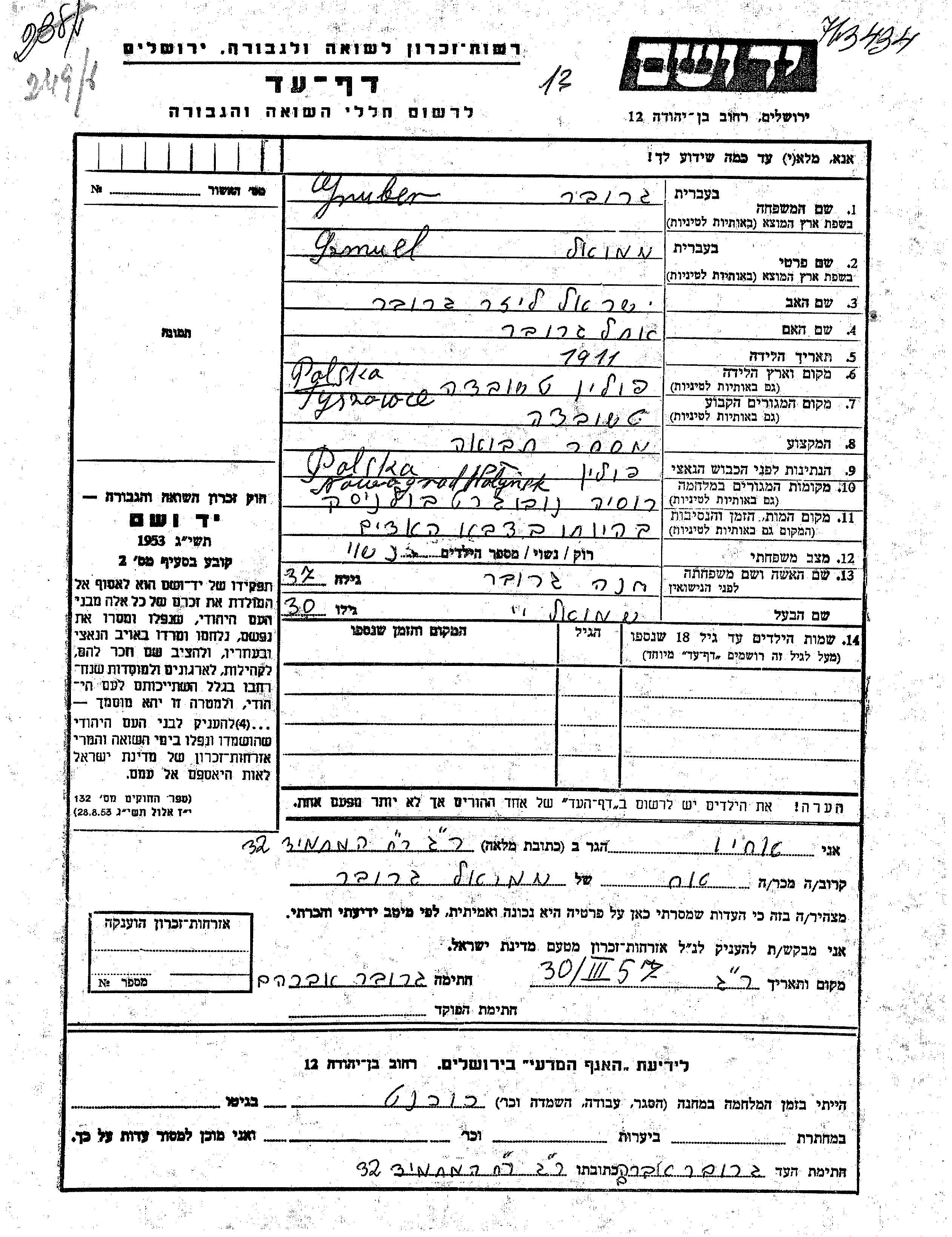 Szmuel Gruber est né à Tyszowce, Pologne en 1911, fils de Yisrael Eliezer et de Etel. Il était Négociant en grain et Mariée à Khana. Avant la seconde guerre mondiale il vivait à Tyszowce, Pologne. Au cours de la guerre, il était à Nowogrod, Pologne. Szmuel a été tué en tant que militaire pendant la Seconde Guerre mondiale. Lieu de la mort: the Soviet armed forces.